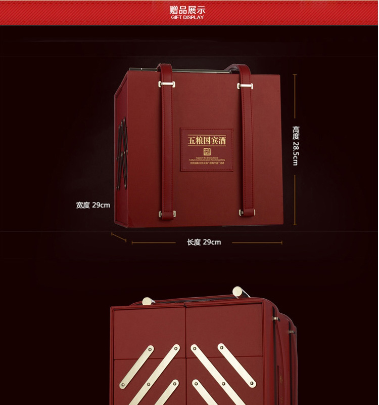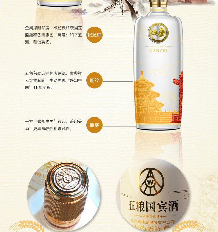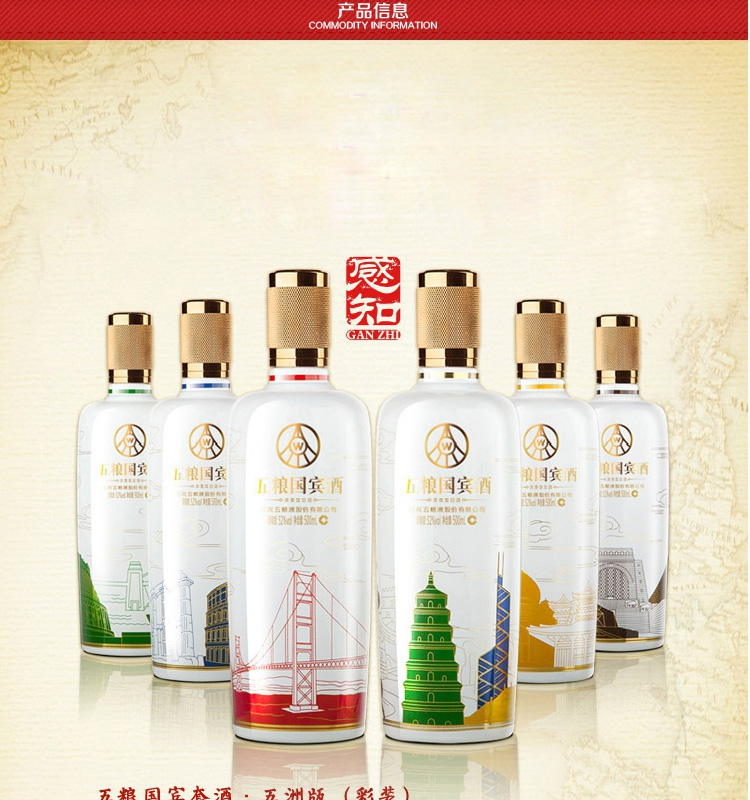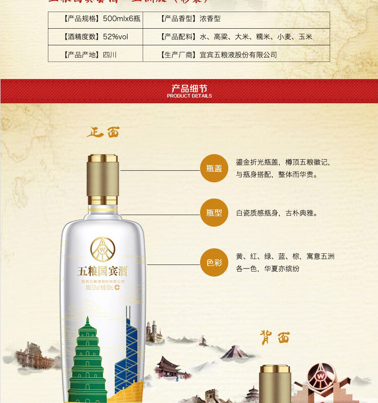 包装:整箱装;容量:500-749mL;香型:浓香型;产地:四川;度数:50度及以上;酒精度:52%vol;容量:500ml*6瓶;产品重量:1465g;包装清单:五粮液股份出品 五粮国宾 套酒(彩装)浓香型白酒 52度 500ml*6瓶 (含套酒礼盒);