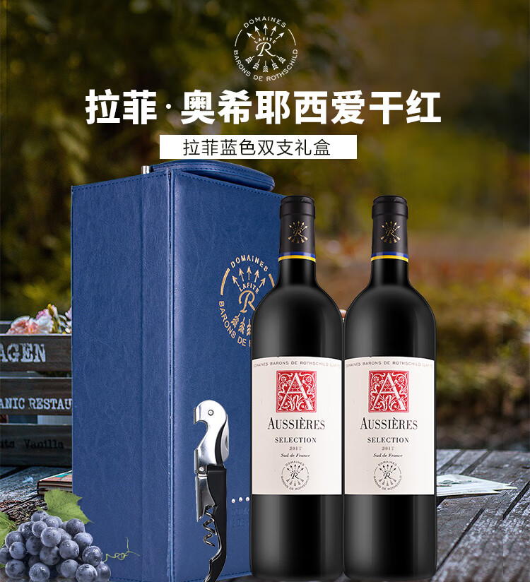 颜色:宝石红;口感:饱满;特性:普通餐酒;国产/进口:进口;适用场景:礼节拜访;包装:礼盒装;酸度:中酸;类别:红葡萄酒;葡萄品种:赤霞珠(Cabernet Sauvignon);类型:静止酒;香型:果香;产地:法国;容量:750mL;甜度:干型;保质期:见背标;酒精度:13.5%vol;原产地:法国;存储方法:恒温、避光、卧放;容量:750ml;产品重量:4.2kg;包装清单:法国进口红酒 拉菲奥希耶西爱干红(Lafite Legend Bordeaux Rouge)葡萄酒 经典蓝双支礼盒带酒具 750ml*2瓶;