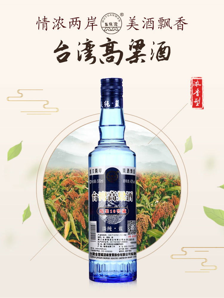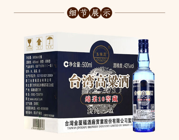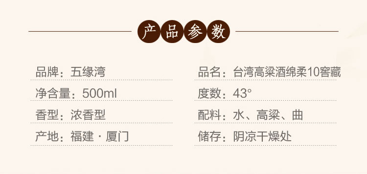 包装:整箱装;容量:500-749mL;香型:浓香型;度数:40-49度;香型:浓香型;产地:福建;度数:43度;包装:整箱装;产品重量(kg):11.67;容量:500ml;包装清单:五缘湾 台湾高粱酒绵柔10窖藏整箱装43度500ml*12瓶 X1;