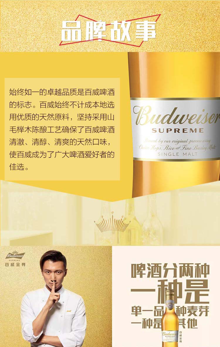 国产/进口:国产;产地:中国大陆;适用场景:家庭聚会,礼节拜访,情侣约会,自斟自饮,派对必备,烧烤撸串,酒吧夜店;包装:瓶装;容量:500mL;类别:黄啤酒;原料:水、麦芽、大米、酒花浸膏、酵母、果葡糖浆;保质期:180天;酒精度:3.6%vol;原产地:中国大陆;原麦汁浓度:9.5°P;存储方法:5°C~25°C避光运输和保存;产品重量:11.5kg;容量:500ml;包装清单:百威(Budweiser)金尊啤酒 大瓶装 500ml*12瓶 Supreme;