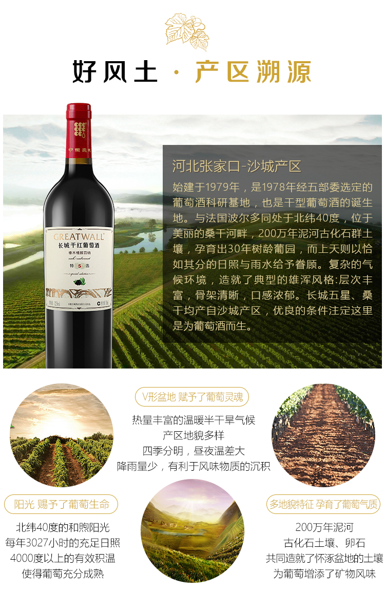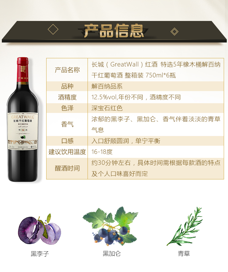 颜色:宝石红;采摘年份:2018年;口感:饱满;特性:精品葡萄酒;国产/进口:国产;适用场景:家庭聚会,礼节拜访,商务宴请,婚礼婚宴,情侣约会,自斟自饮,闺蜜私语,派对活动;包装:整箱装;酸度:中酸;类别:红葡萄酒;葡萄品种:赤霞珠(Cabernet Sauvignon),蛇龙珠(Cabernet Gernischt),品丽珠(Cabernet Franc);类型:静止酒;香型:果香,植物;产地:中国大陆;容量:750mL;甜度:干型;系列:特选;保质期:3650天;酒精度:12.5%vol;原产地:中国大陆;存储方法:避免阳光直射,于5℃~25℃干燥通风处卧放或倒放为宜。;容量:750ml;产品重量:8.4kg;包装清单:长城(GreatWall)红酒 特选5橡木桶解百纳干红葡萄酒 750ml*6瓶 整箱装*1箱;