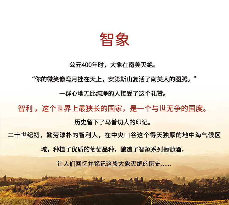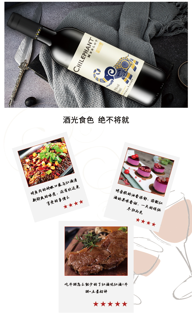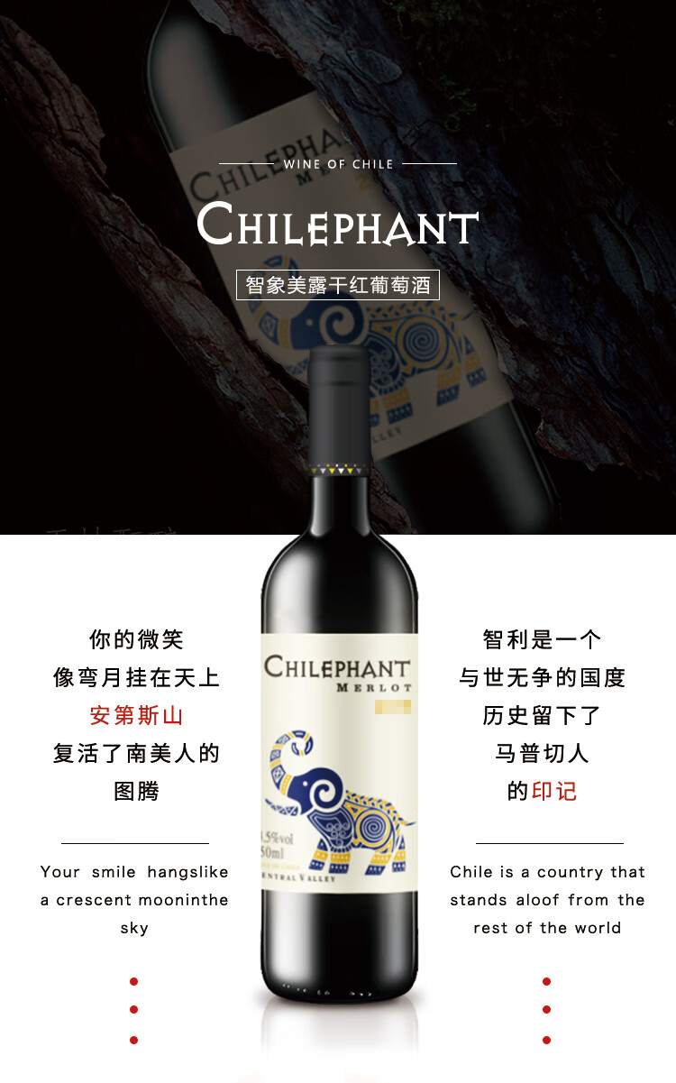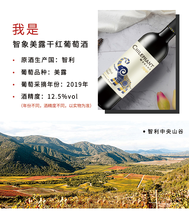 颜色:宝石红;口感:清新;特性:普通餐酒;国产/进口:进口;适用场景:礼节拜访,商务宴请,婚礼婚宴,情侣约会,家庭聚会,自斟自饮,闺蜜私语,派对活动;包装:整箱装;酸度:低酸;类别:红葡萄酒;葡萄品种:梅洛(Merlot);类型:静止酒;香型:果香;产地:智利;容量:750mL;甜度:干型;保质期:10年;酒精度:12.5;原产地:智利;存储方法:平放或倒置、闭关、与阴凉处保存为宜;容量:750ML;产品重量:7.2kg;包装清单:智利进口红酒智象美露干红葡萄酒 750ml*6瓶;