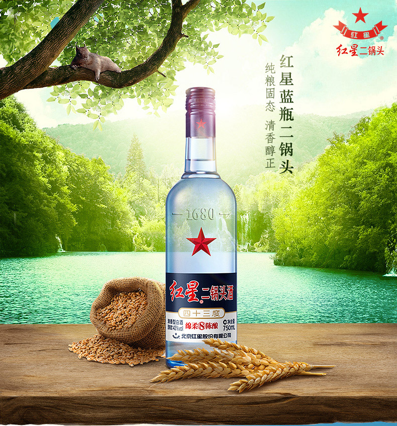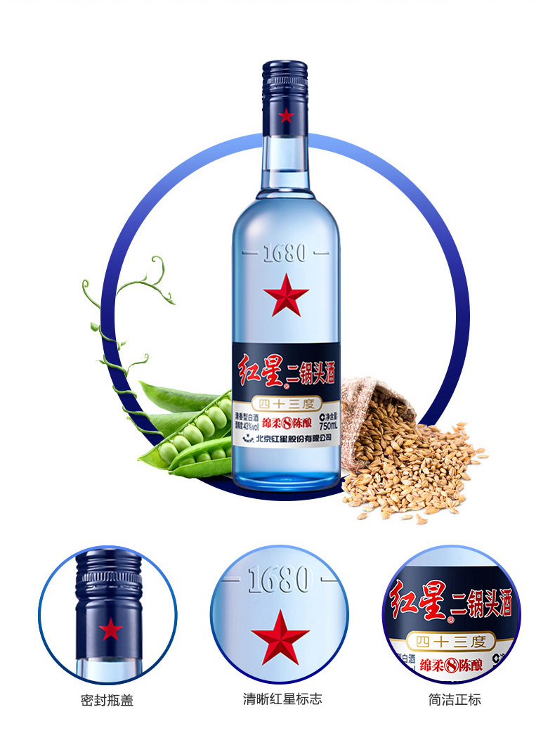 包装:瓶装;容量:500-749mL;香型:清香型;度数:40-49度;香型:清香型;产地:北京市,天津市,山西晋中市;酒精度:43%vol;包装:瓶装;产品重量:1200g;容量:750ml;包装清单:红星 蓝瓶二锅头 绵柔8陈酿 43度 750ml;