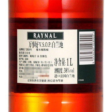 适用场景:商务宴请;包装:礼盒装;容量:1L及以上;特性:VSOP;国产/进口:进口;产地:法国;酒精度:38%vol;原料:水、葡萄汁、焦糖色;保质期:长期;产地:法国;特性:VSOP;存储方法:常温避光;容量:1L;包装:礼盒;产品重量(kg):1.640;包装清单:万事好(Raynal)VSOP 白兰地 1L × 1;