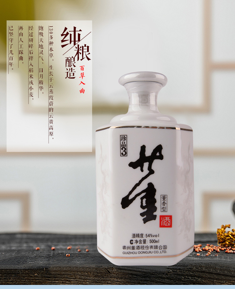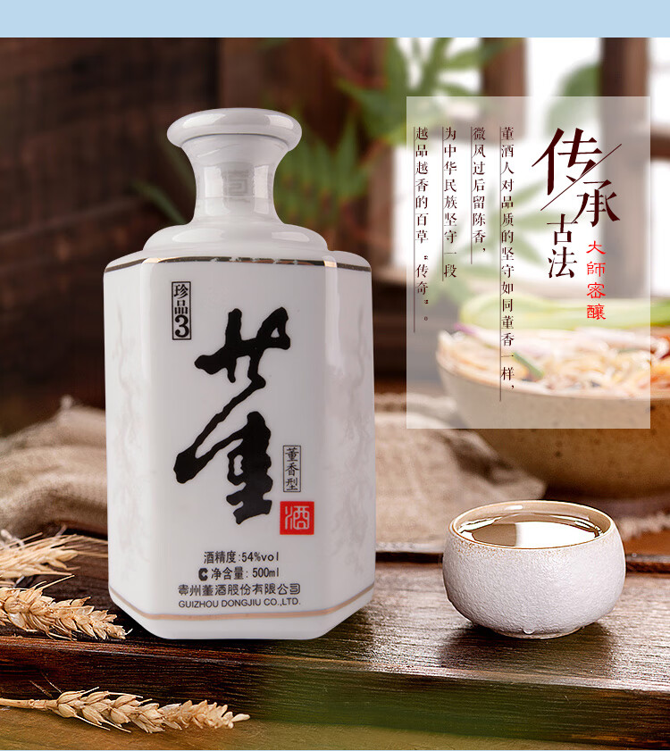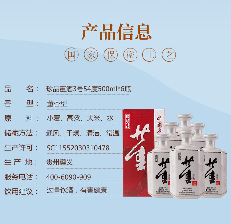 包装:整箱装;容量:376-499mL;香型:董香型;产地:贵州;度数:50度及以上;酒精度:54%vol;容量:500;产品重量:8.37g;包装清单:董酒 白酒 珍品3号 董香型 54度 500ml*6瓶 整箱装*1;