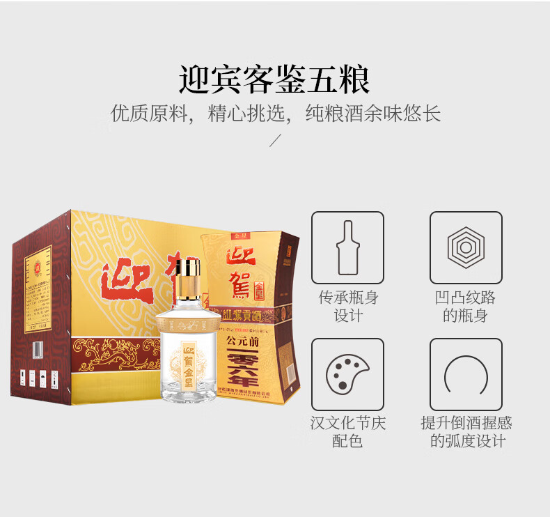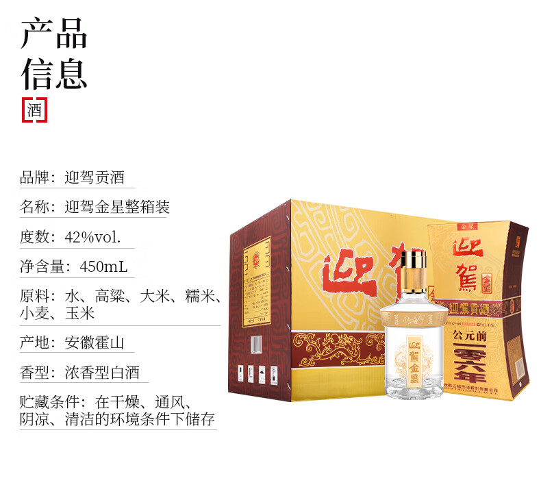 包装:整箱装;容量:376-499mL;香型:浓香型;产地:安徽;度数:40-49度;酒精度:42%vol;容量:450ml;产品重量:9340g;包装清单:迎驾贡酒 金星 42度 450ml*6、礼品袋*3;