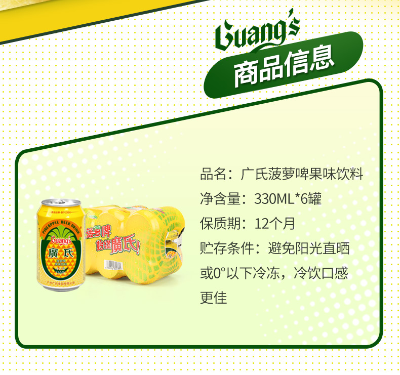 国产/进口:国产;产地:中国大陆;适用场景:家庭聚会,礼节拜访,情侣约会,自斟自饮,派对必备,烧烤撸串,酒吧夜店;包装:听装;容量:330mL;类别:无醇/果啤;原料:水、果葡糖浆;系列:菠萝啤果味饮料;保质期:365天;酒精度:0;原产地:中国大陆;原麦汁浓度:0;存储方法:常温;产品重量:2.16kg;容量:330ml*6;包装清单:广氏 菠萝啤果味饮料 330ml*6罐 塑膜装;