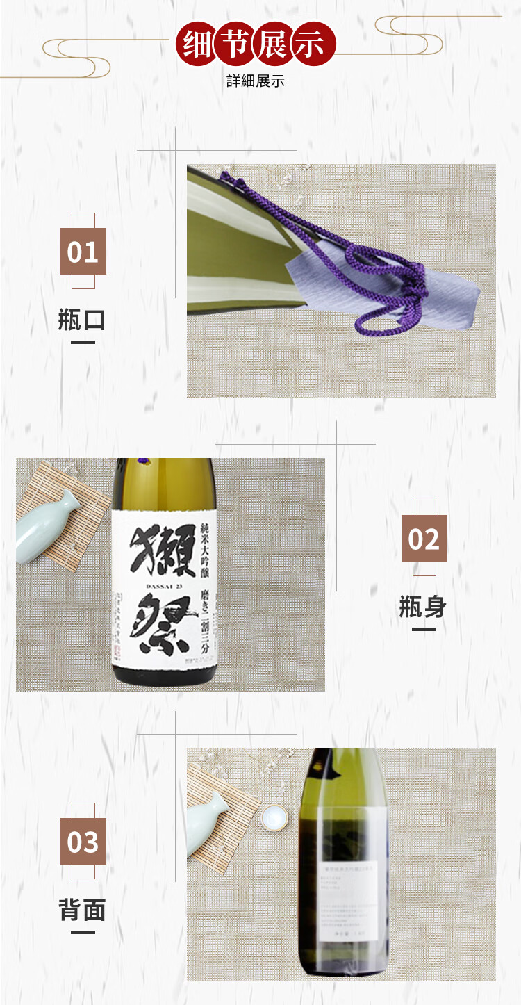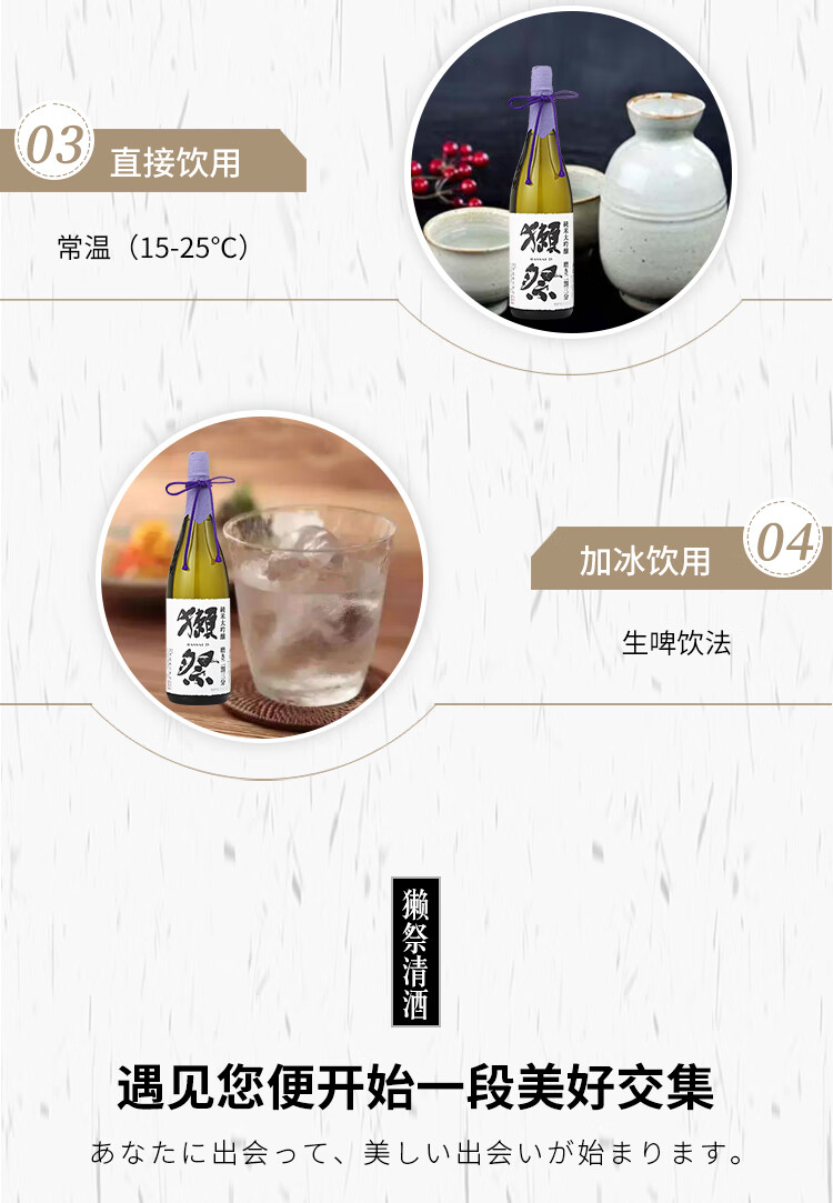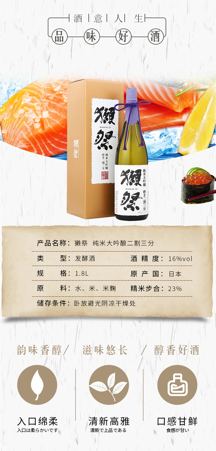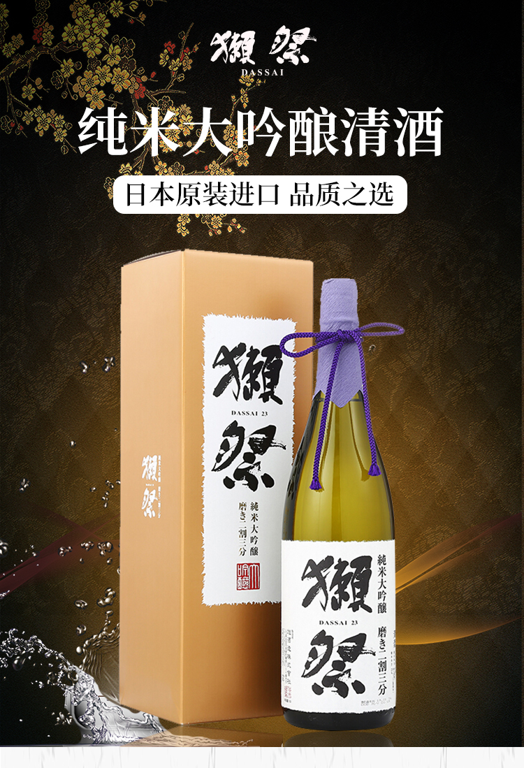 国产/进口:进口;产地:日本;适用场景:情侣约会,商务宴请,亲友馈赠,自斟自饮,家庭聚会;包装:瓶装;容量:1L及以上;原料:水、大米、米麹;保质期:长期有效;酒精度:16%vol;存储方法:请放置阴凉避光处;产品重量:0kg;包装清单:獭祭 清酒 纯米大吟酿二割三分 1.8L×1;