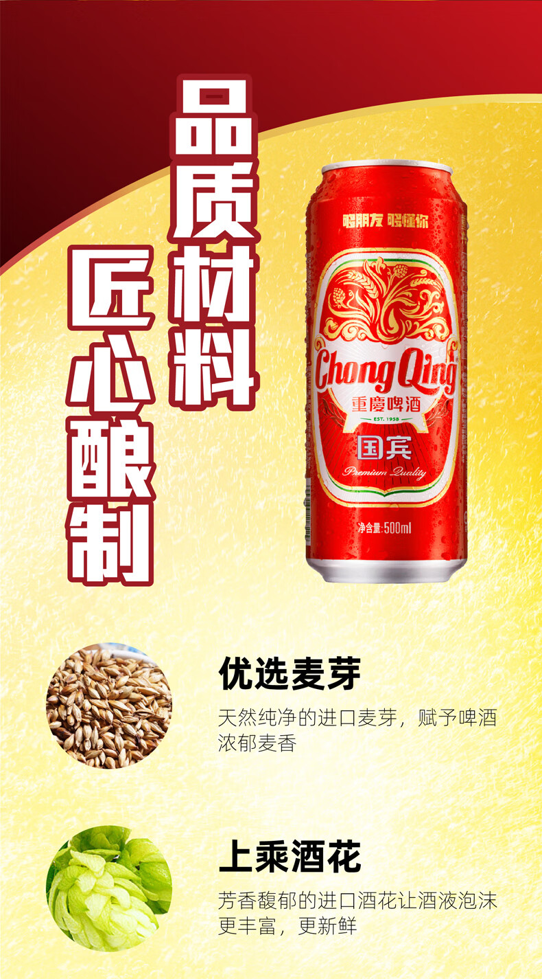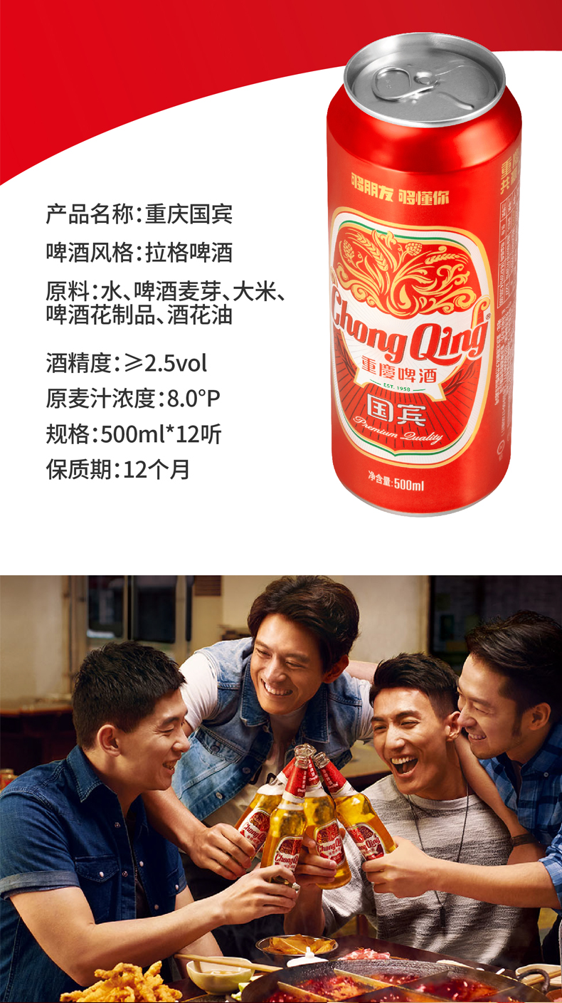 国产/进口:国产;产地:中国大陆;适用场景:礼节拜访,家庭聚会,自斟自饮,情侣约会,烧烤撸串;包装:听装;容量:500mL;类别:黄啤酒;原料:水、麦芽、大米、啤酒花制品;保质期:12个月;酒精度:2.5;原产地:中国大陆;原麦汁浓度:8;存储方法:5℃~25℃阴凉、干燥、通风处保存;产品重量:6.4kg;容量:6000ml;包装清单:重庆国宾啤酒500ml*12罐;