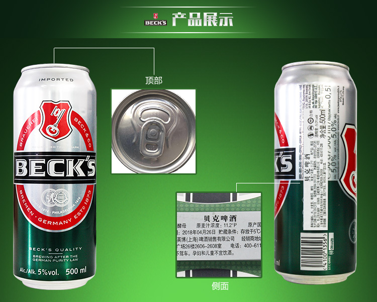 国产/进口:进口;产地:德国;适用场景:家庭聚会,礼节拜访,情侣约会,自斟自饮,派对必备,烧烤撸串,酒吧夜店;包装:听装;容量:500mL;类别:黄啤酒;原料:水、大麦芽、啤酒花、酵母;国产/进口:进口;保质期:12个月;酒精度:≥5.0%vol;原产地:德国;原麦汁浓度:11.2°P;存储方法:5℃~25℃,防止阳光直射;类别:黄啤酒;包装:听装;产品重量:12.74kg;容量:500ml;包装清单:贝克啤酒500ml*24听;