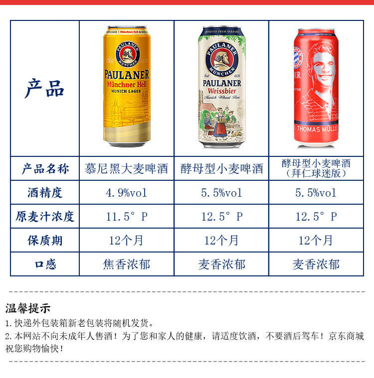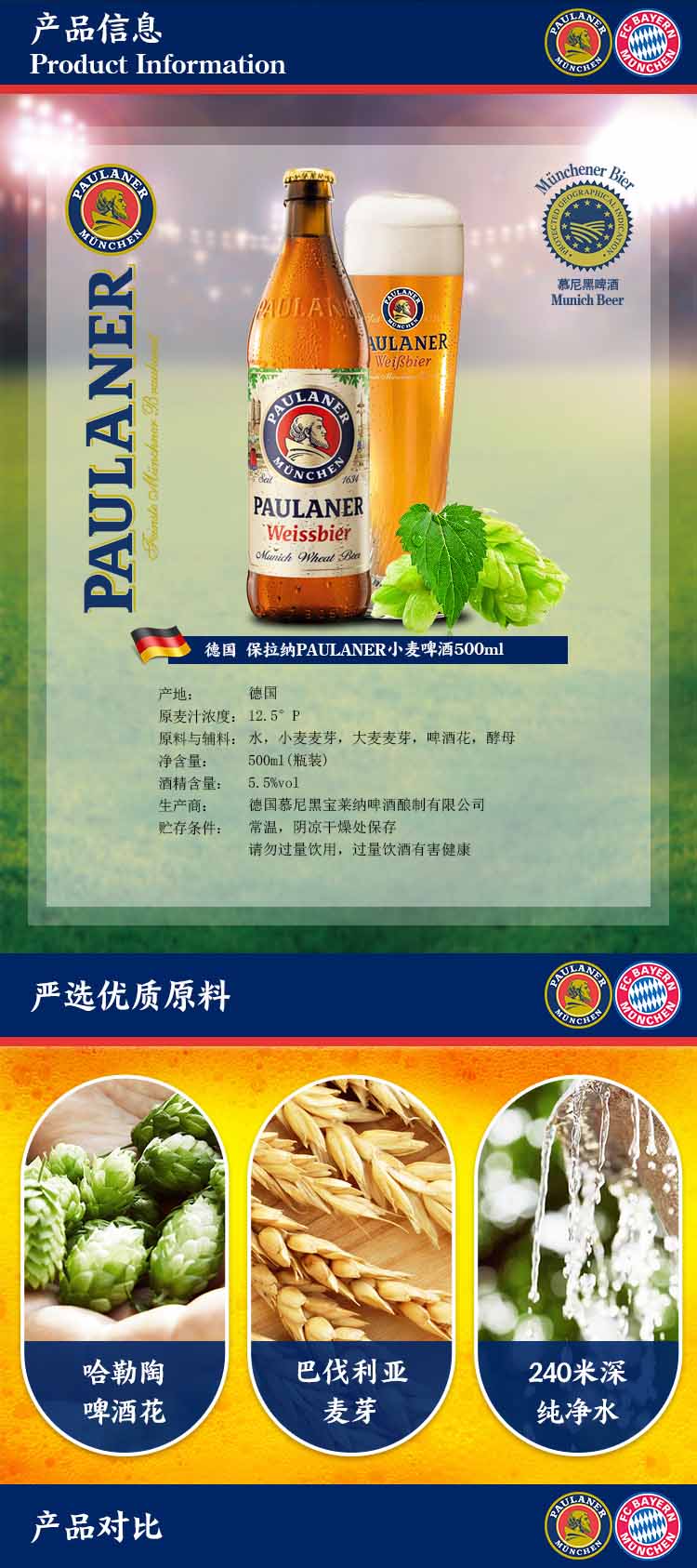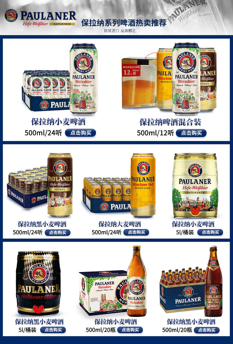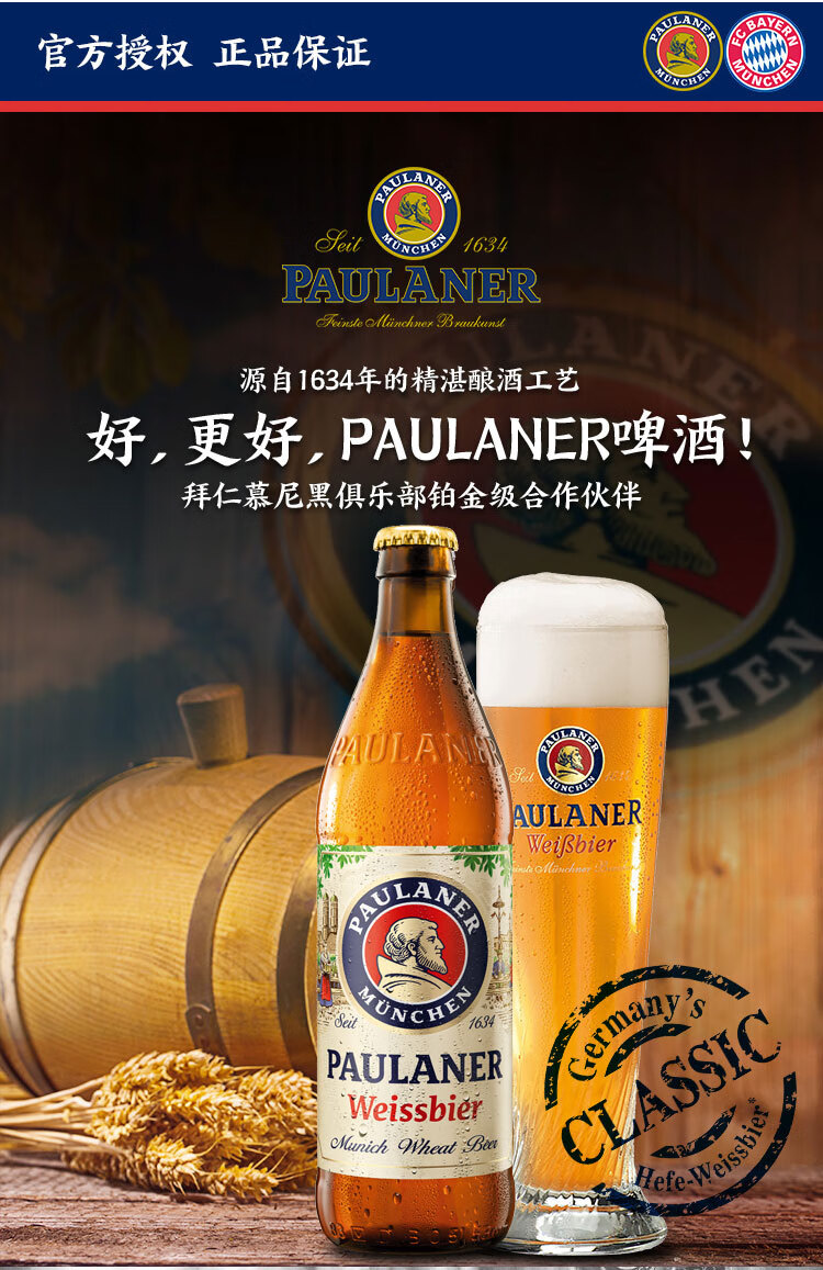 国产/进口:进口;产地:德国;适用场景:礼节拜访,家庭聚会,自斟自饮,情侣约会,烧烤撸串,派对必备,酒吧夜店;包装:瓶装;容量:500mL;类别:黄啤酒;原料:水、麦芽、啤酒花;系列:小麦;保质期:365天;酒精度:5.5%vol;原产地:德国;原麦汁浓度:12.5°P;存储方法:常温避光保存;产品重量:16.13kg;容量:500ml;包装清单:保拉纳/柏龙(PAULANER)小麦啤酒500ml*20瓶装 整箱装 德国进口*1;