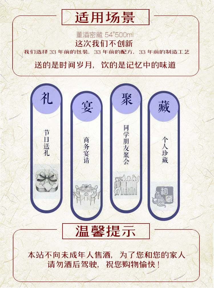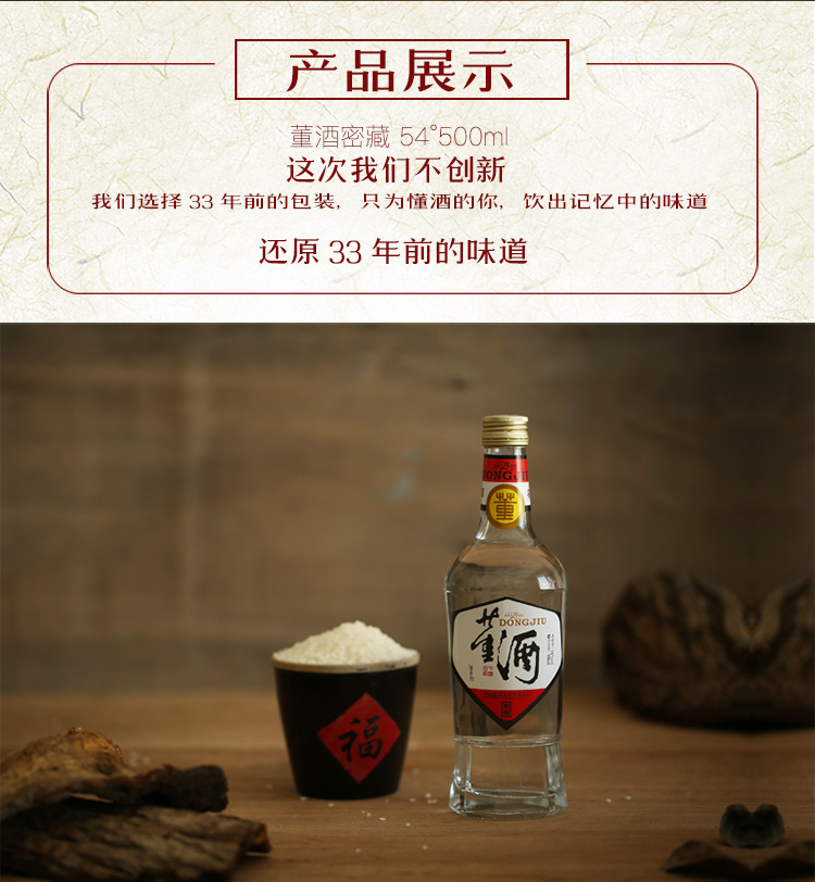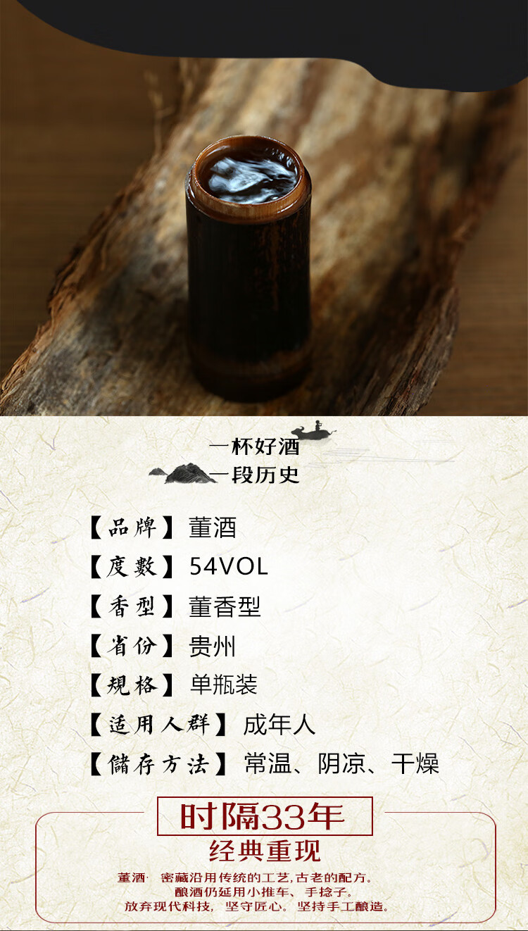 包装:瓶装;容量:376-499mL;香型:董香型;产地:贵州;度数:50度及以上;酒精度:54%vol;容量:500;产品重量:1.09g;包装清单:董酒 白酒 密藏 董香型 54度 500ml*1;