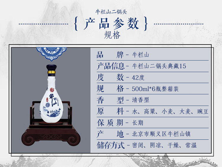 包装:整箱装;容量:500-749mL;香型:清香型;产地:北京;度数:40-49度;酒精度:42%vol;容量:500-749mL;产品重量:0g;包装清单:牛栏山 二锅头典藏15 清香型白酒 42度 500ml*6瓶 整箱装*1箱;
