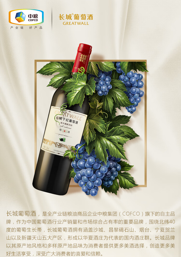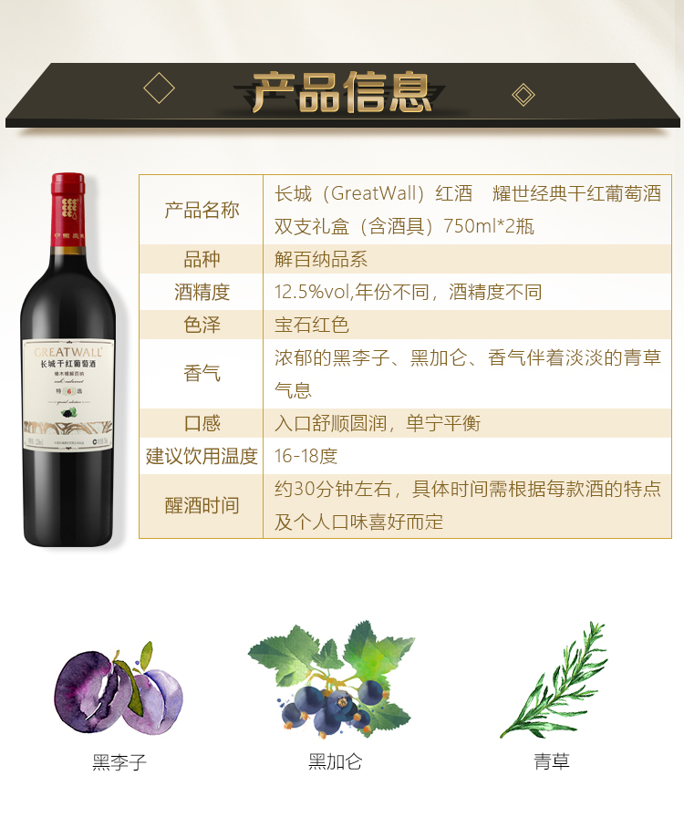 颜色:宝石红;口感:柔和;特性:普通餐酒;国产/进口:国产;适用场景:家庭聚会,礼节拜访,商务宴请,婚礼婚宴,情侣约会,自斟自饮,闺蜜私语,派对活动;包装:礼盒装;酸度:中酸;类别:红葡萄酒;葡萄品种:赤霞珠(Cabernet Sauvignon);类型:静止酒;香型:果香;产地:中国大陆;容量:750mL;甜度:干型;系列:特藏;保质期:3650天;酒精度:13%vol;原产地:中国大陆;存储方法:避免阳光直射,于5℃~25℃干燥通风处卧放或倒放为宜;容量:750ml;产品重量:4.26kg;包装清单:长城(GreatWall ) 红酒 耀世经典干红葡萄酒双支礼盒(含酒具) 750ml*2瓶*1;