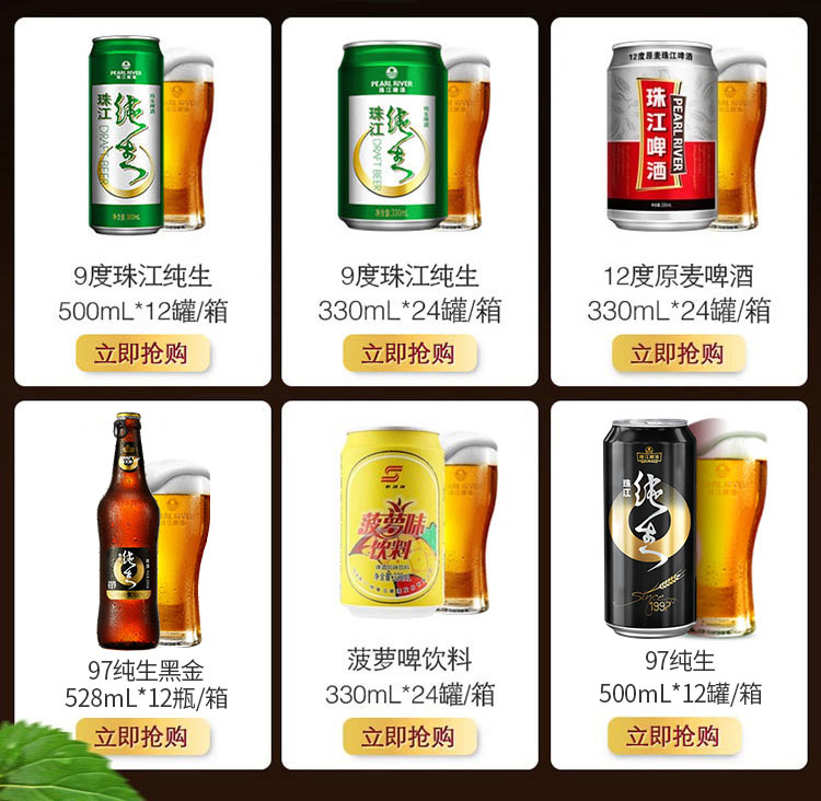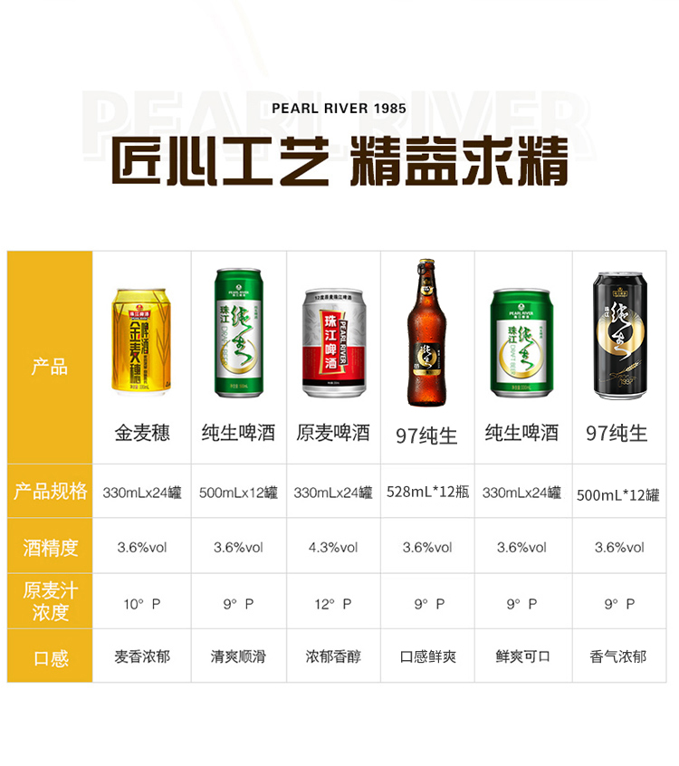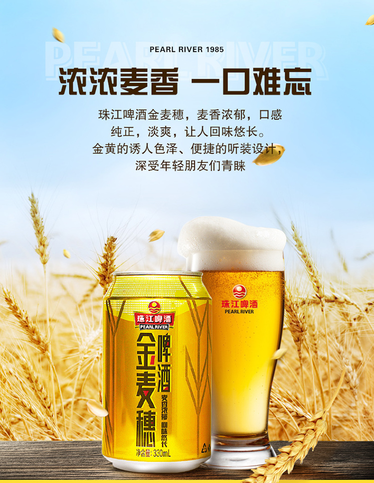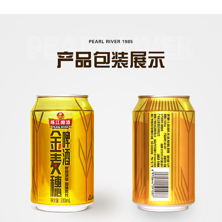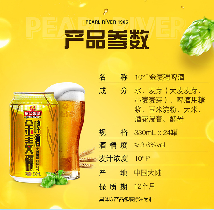 国产/进口:国产;产地:中国大陆;适用场景:礼节拜访,家庭聚会,自斟自饮,情侣约会,烧烤撸串,派对必备,酒吧夜店;包装:听装;容量:330mL;类别:黄啤酒;原料:水、优质大麦麦芽、大米、淀粉、啤酒用糖浆、酒花浸膏、酵母(具体以产品包装标注为准);系列:珠江金麦穗啤酒;保质期:365天;酒精度:3.6;原产地:中国大陆;原麦汁浓度:10°P;存储方法:5°C~25°C避光保存;产品重量:8.55kg;容量:330mL;包装清单:珠江啤酒*24罐装;