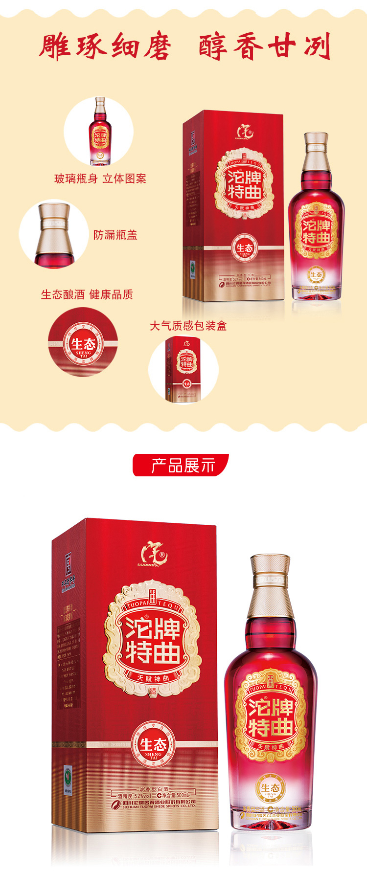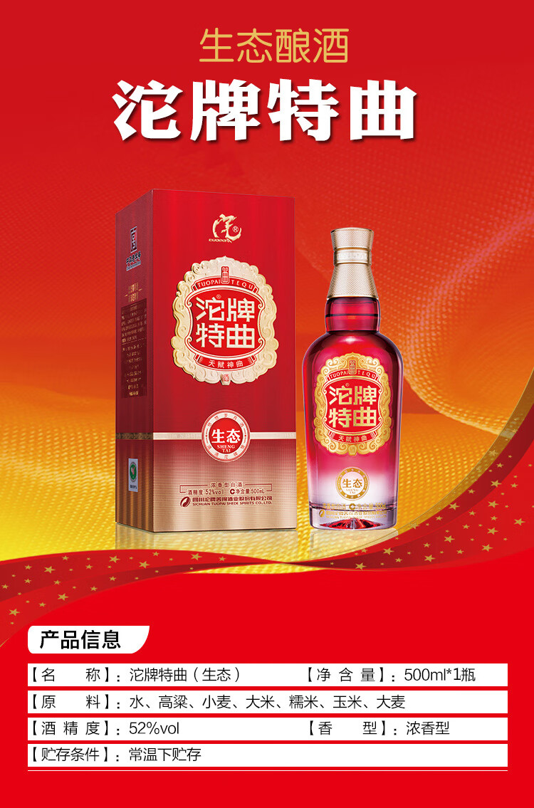 包装:瓶装;容量:500-749mL;香型:浓香型;产地:四川;度数:50度及以上;酒精度:52%vol;容量:500ml;产品重量:1275g;包装清单:沱牌特曲 生态 52度 500ml*1瓶;