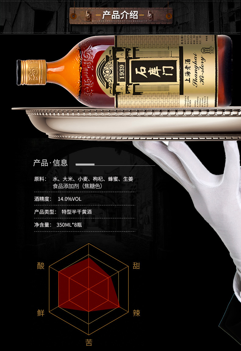 口味:半干型黄酒(总糖:15.0-40.0g/L);度数:10-19度;产地:其它;适用场景:商务宴请,礼节拜访,家庭聚会,朋友小聚,自斟自饮;包装:整箱装;容量:500mL以下;保质期:3年;酒精度:14;存储方法:阴凉干燥;容量:2800mL;产品重量:6.18kg;包装清单:石库门 上海老酒 黑色醇香1939 特型半干型黄酒 14度 350ml*8瓶 整箱装*1;