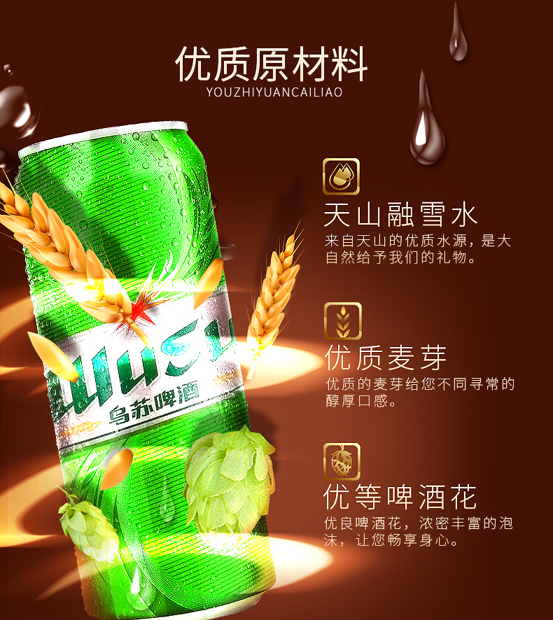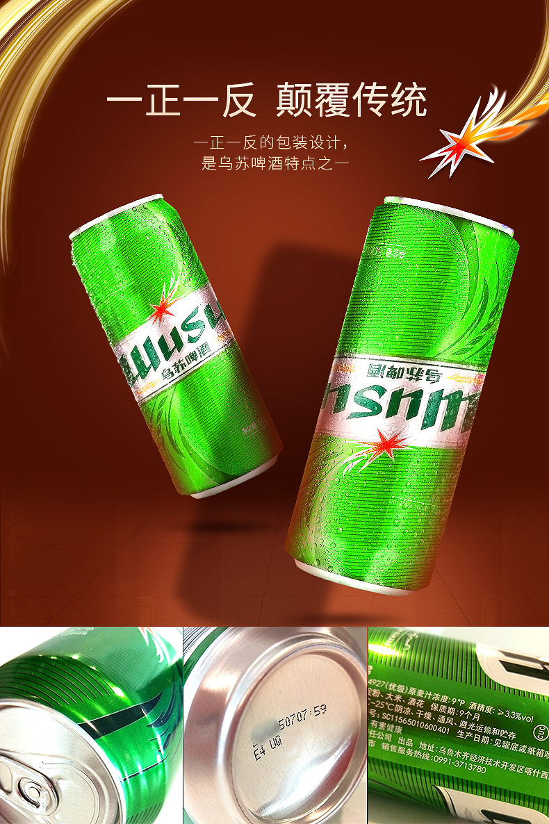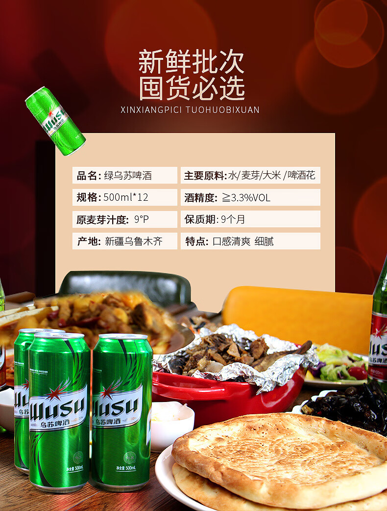 国产/进口:国产;产地:中国大陆;适用场景:礼节拜访,家庭聚会,自斟自饮,情侣约会,烧烤撸串,派对必备,酒吧夜店;包装:听装;容量:500mL;类别:黄啤酒;原料:水,麦芽,大米,啤酒花;保质期:270天;酒精度:≥3.3%vol;原产地:中国大陆;原麦汁浓度:9°P;存储方法:建议5-25℃干燥通风避光储存;产品重量:6.4kg;容量:500ML;包装清单:绿罐乌苏500ml*12罐;