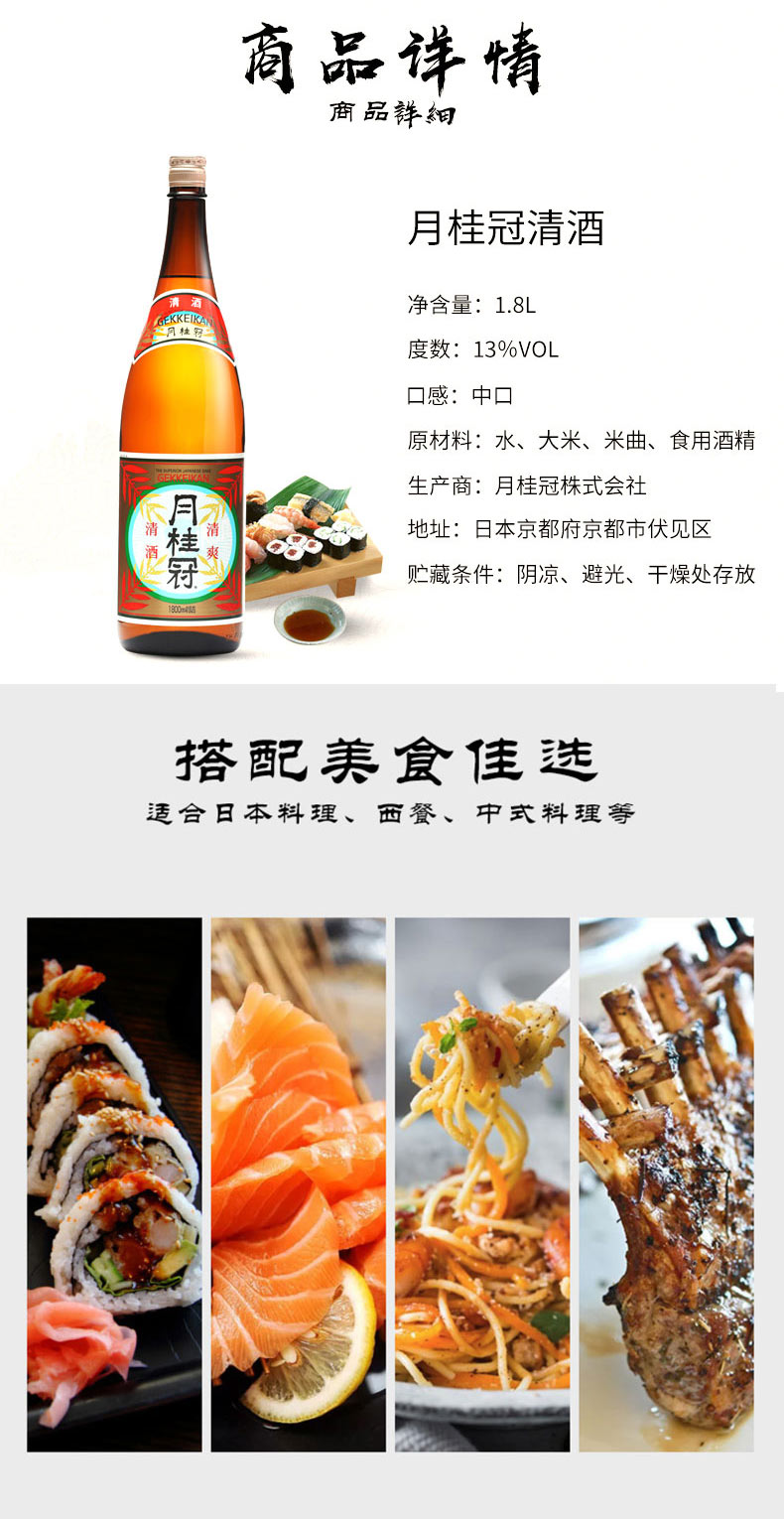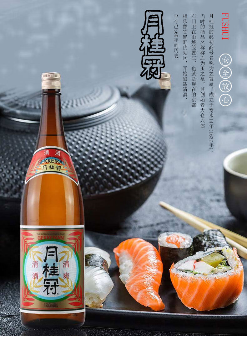 适用场景:家庭聚会,商务宴请,自斟自饮;包装:瓶装;容量:1L及以上;国产/进口:进口;产地:日本;原料:水、大米、米曲、食用酒精;产地:日本;保质期:长期保存;酒精度:13%vol;存储方法:常温避光保存;包装:瓶装;产品重量(kg):2.77;容量:1800L;包装清单:月桂冠(Gekkeikan)洋酒 清爽清酒 1.8L*1;