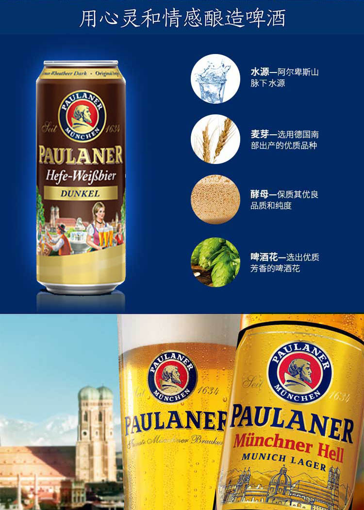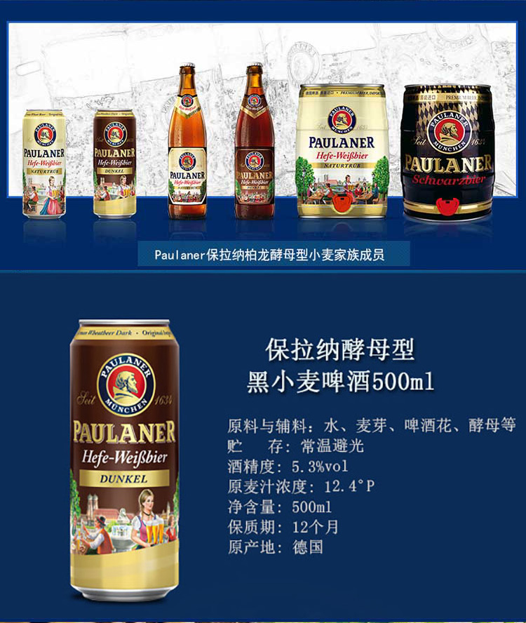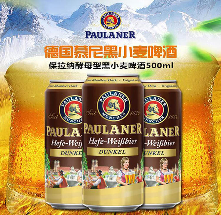 国产/进口:进口;产地:德国;适用场景:礼节拜访,家庭聚会,自斟自饮,情侣约会,烧烤撸串,派对必备,酒吧夜店;包装:听装;容量:500mL;类别:黑啤酒;原料:水、麦芽、啤酒花、酵母等;系列:黑小麦;保质期:365天;酒精度:5.3%vol;原产地:德国;原麦汁浓度:12.3°P;存储方法:常温避光保存;产品重量:12.6kg;容量:500ml;包装清单:保拉纳/柏龙(PAULANER)黑小麦啤酒 500ml*24听 整箱装 德国进口*1;