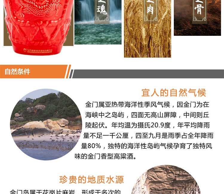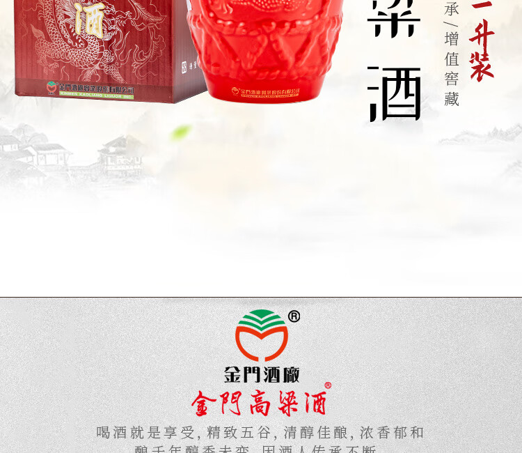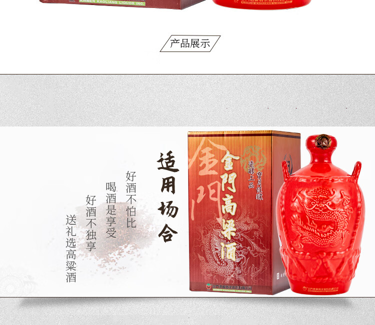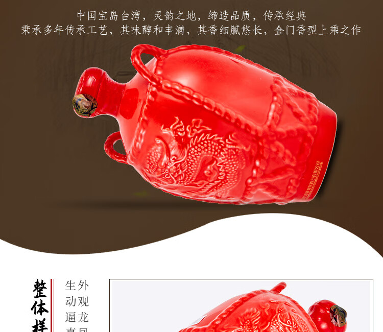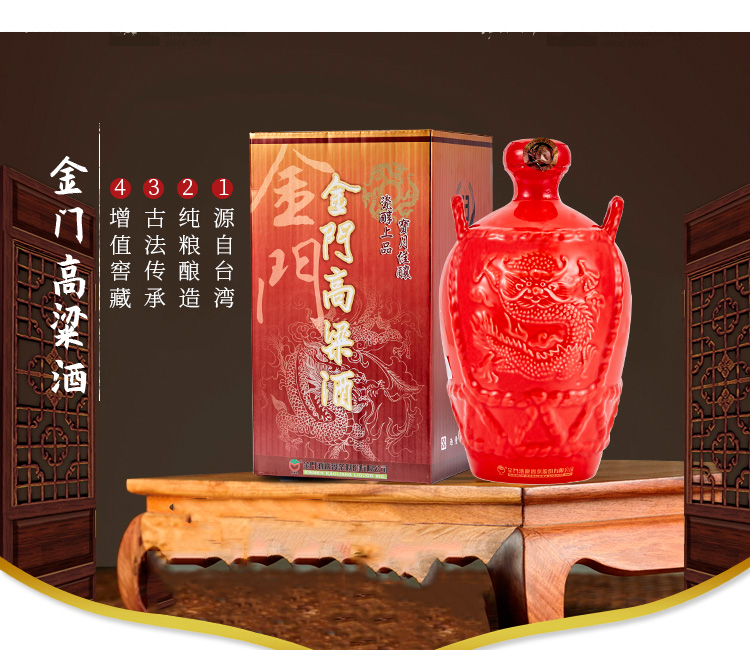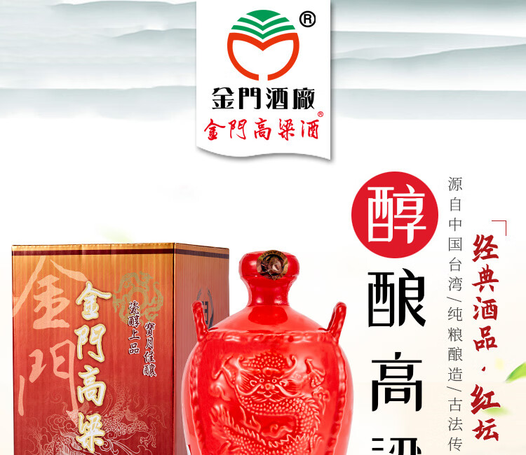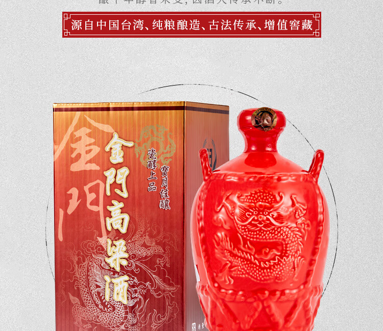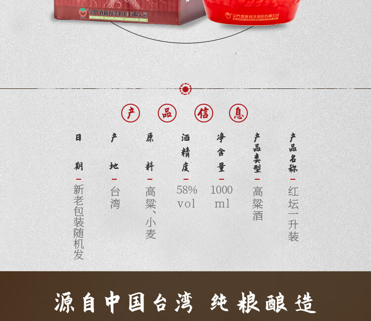 包装:瓶装;容量:750mL及以上;香型:清香型;产地:中国台湾;度数:50度及以上;酒精度:58%vol;容量:1000ml;产品重量:1940g;包装清单:金门高粱酒 红坛 58度1000ml*1;
