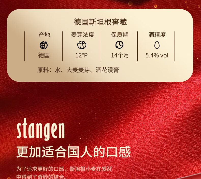 国产/进口:进口;产地:德国;适用场景:家庭聚会,礼节拜访,情侣约会,自斟自饮,派对必备,烧烤撸串,酒吧夜店;包装:组合装;容量:500mL;类别:黄啤酒;原料:水、大麦麦芽、酒花浸膏;系列:奥丁格;保质期:420天;酒精度:5.4%vol;原产地:德国;原麦汁浓度:12°P;存储方法:置于阴凉处;产品重量:12.63kg;容量:500ml;包装清单:斯坦根(stangen)窖藏啤酒 500ml*24听 整箱装;
