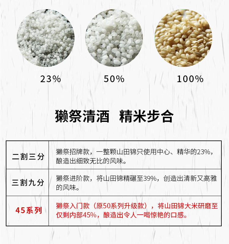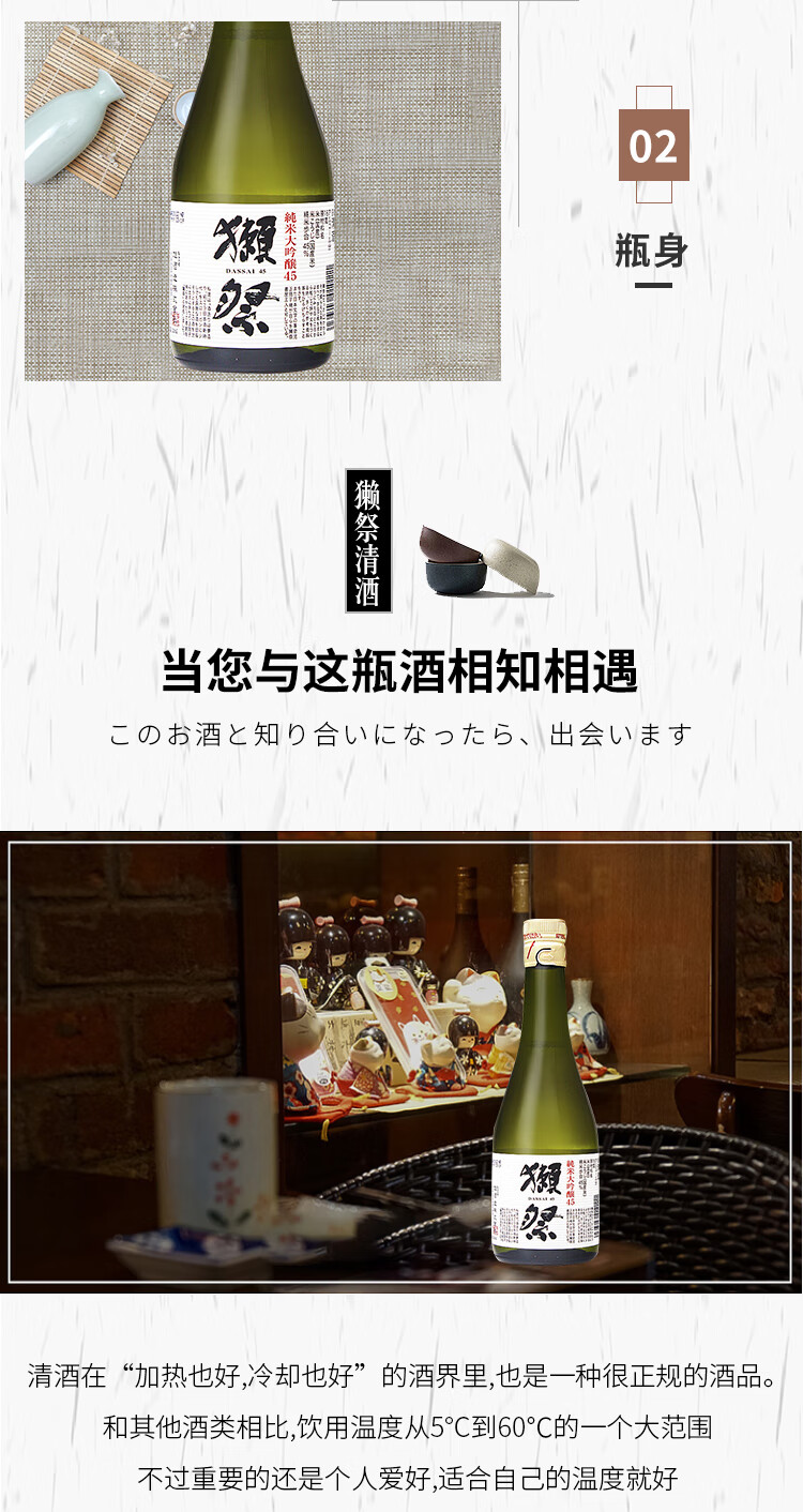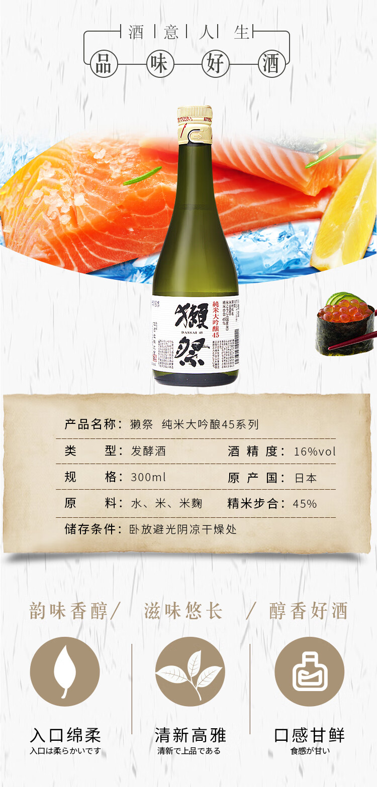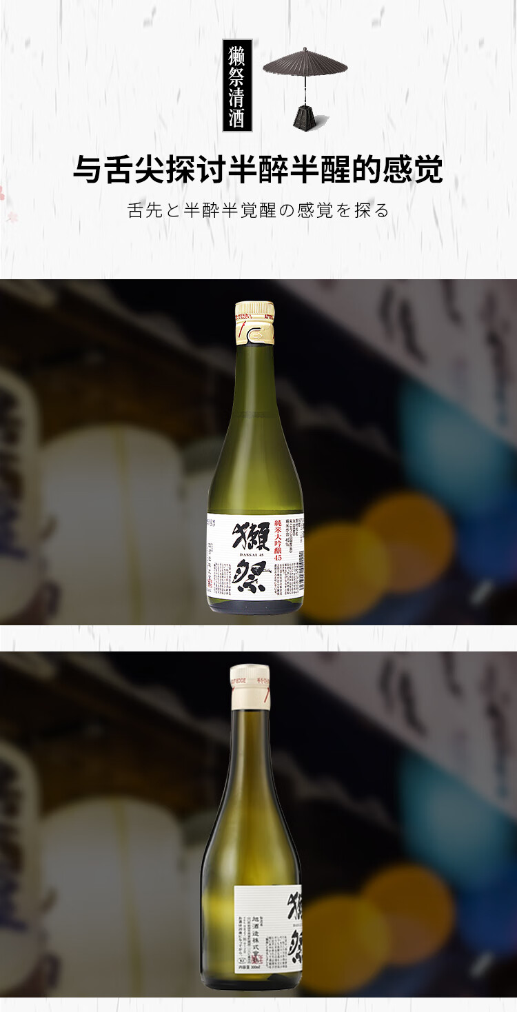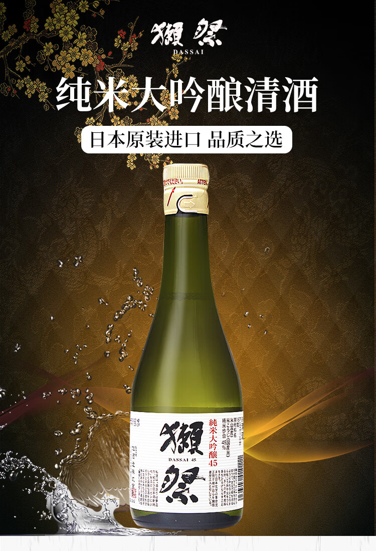 适用场景:情侣约会,家庭聚会;包装:瓶装;容量:200-374mL;国产/进口:进口;产地:日本;原料:水、大米、米麹;保质期:长期有效;酒精度:16%vol;存储方法:请放置于阴凉避光处;产品重量:0kg;包装清单:獭祭 清酒 纯米大吟酿45 300ml(原50的升级版)×1;