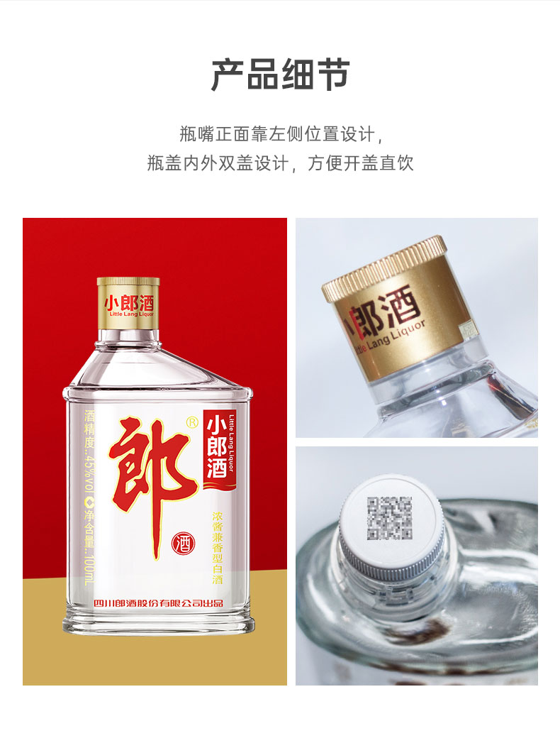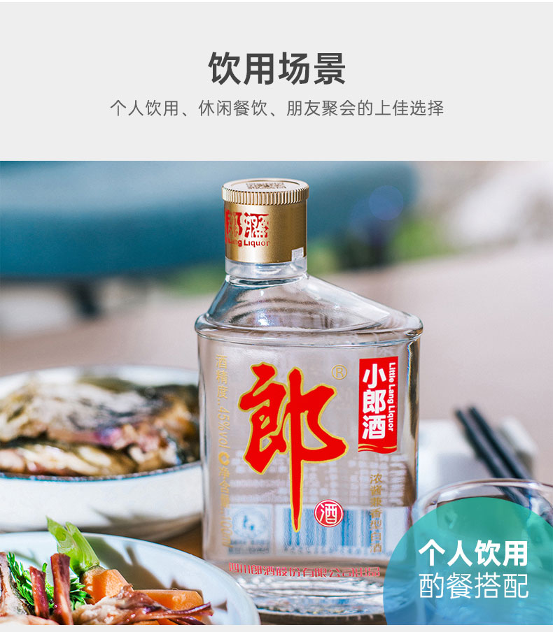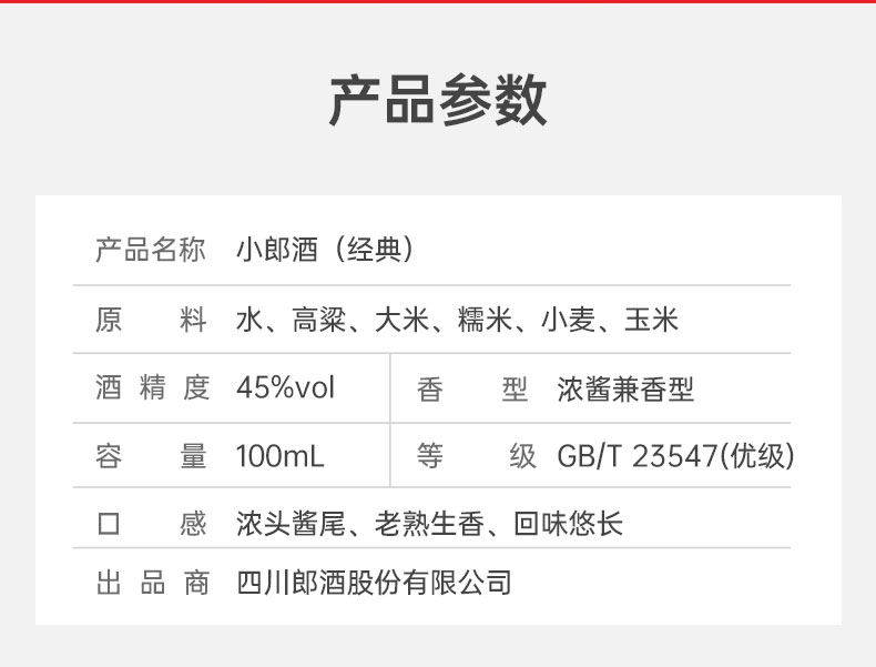 包装:整箱装;容量:375mL及以下;香型:兼香型;产地:四川;度数:40-49度;酒精度:45%vol;容量:100ml*6;产品重量:1862g;包装清单:100ml*6瓶;