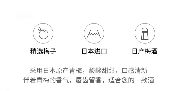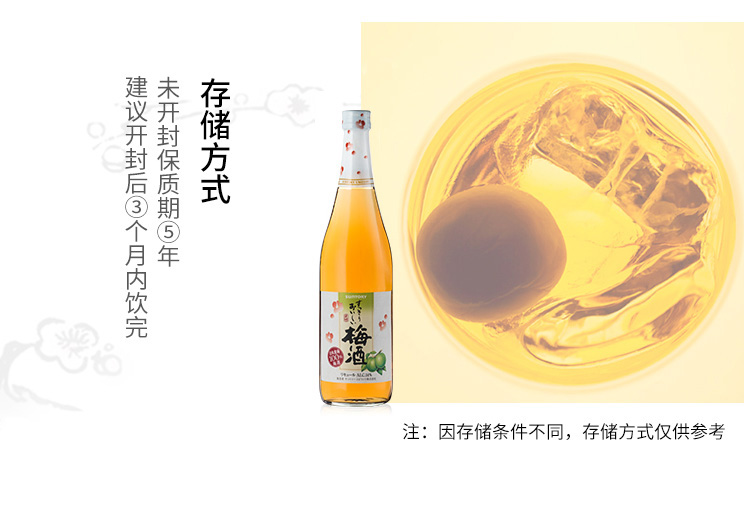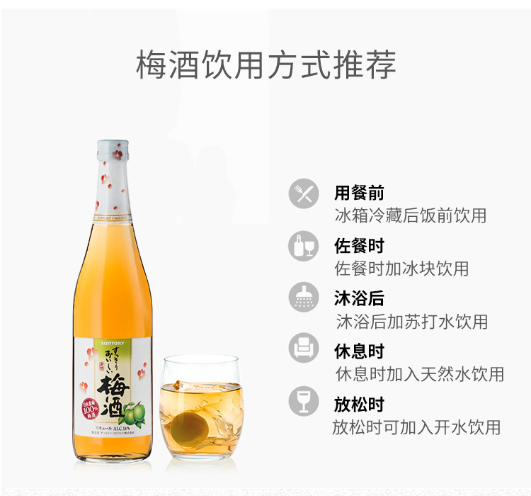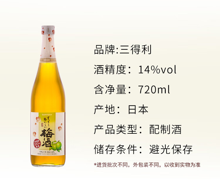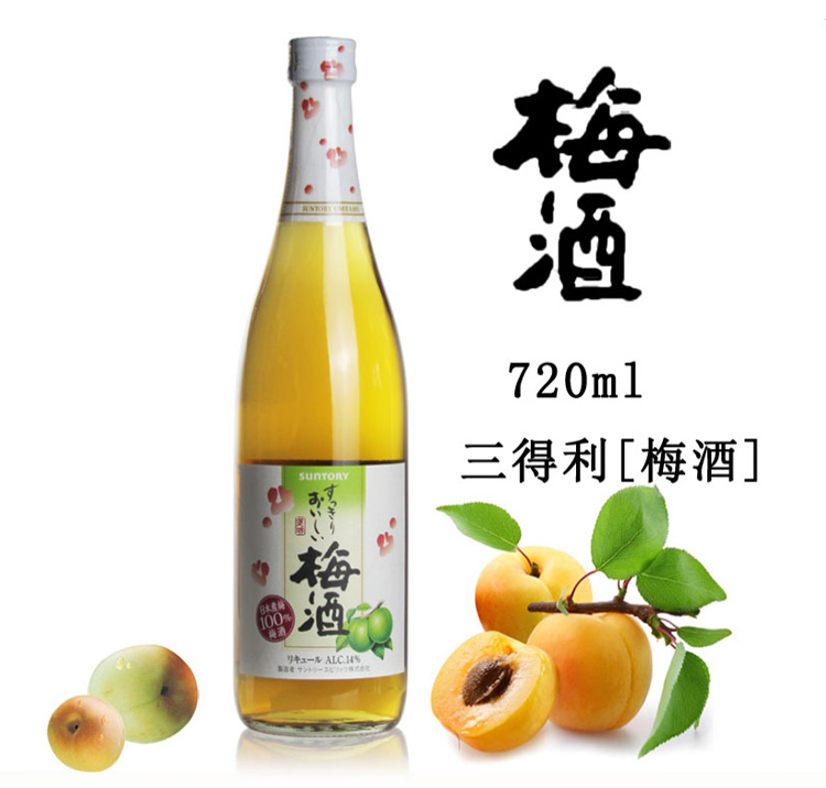 适用场景:家庭聚会;包装:瓶装;容量:700-999mL;特性:其它;国产/进口:进口;产地:日本;原料:水、白砂糖、食用酒精、梅子、柠檬酸、白兰地(葡萄、水、焦糖色)、梅子味食用香料、焦糖色;产地:日本;特性:其它;保质期:5年;酒精度:14%vol;存储方法:常温避光保存;包装:瓶装;容量:720mL;产品重量:1.2kg;包装清单:三得利梅酒720ml× 1;