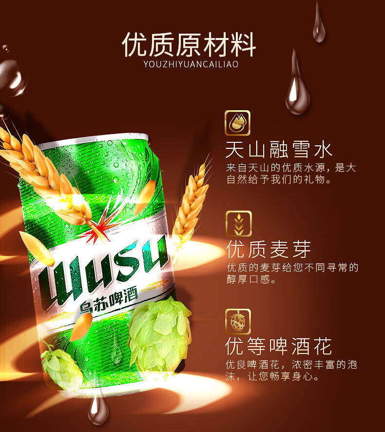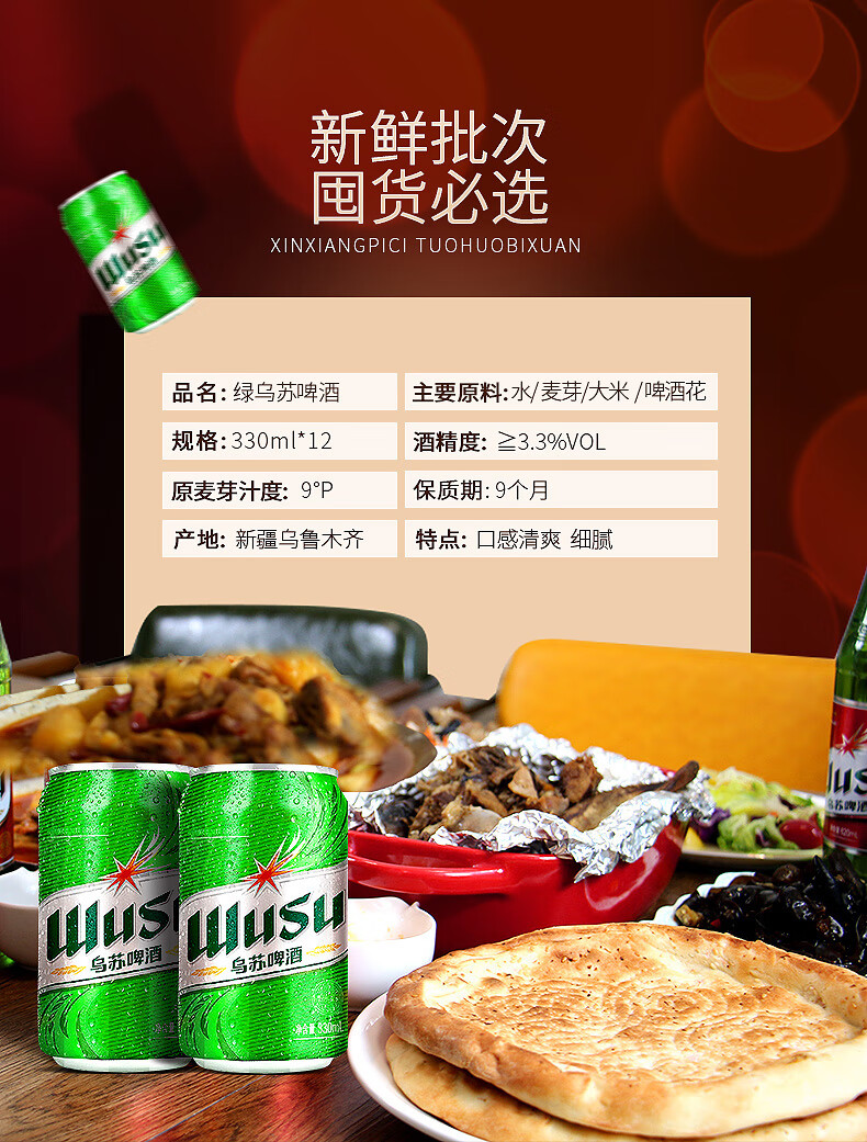 国产/进口:国产;产地:中国大陆;适用场景:礼节拜访,家庭聚会,自斟自饮,情侣约会,烧烤撸串,派对必备,酒吧夜店;包装:听装;容量:330mL;类别:黄啤酒;原料:水,麦芽,大米,啤酒花;保质期:270天;酒精度:≥3.3%vol;原产地:中国大陆;原麦汁浓度:9°P;存储方法:建议5-25℃干燥通风避光储存;产品重量:4.3kg;容量:330ML;包装清单:绿罐乌苏330ml*12罐;