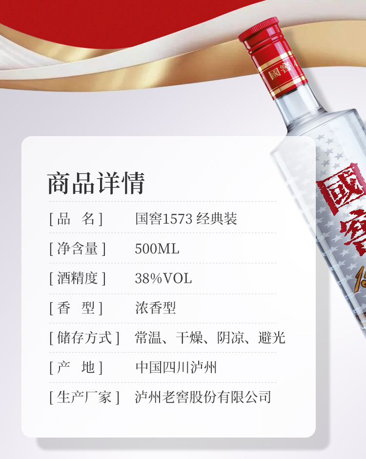 包装:瓶装;容量:376-499mL;香型:浓香型;产地:四川;度数:35-39度;酒精度:38%vol;容量:500ml;产品重量:1000g;包装清单:国窖1573 38度×1;