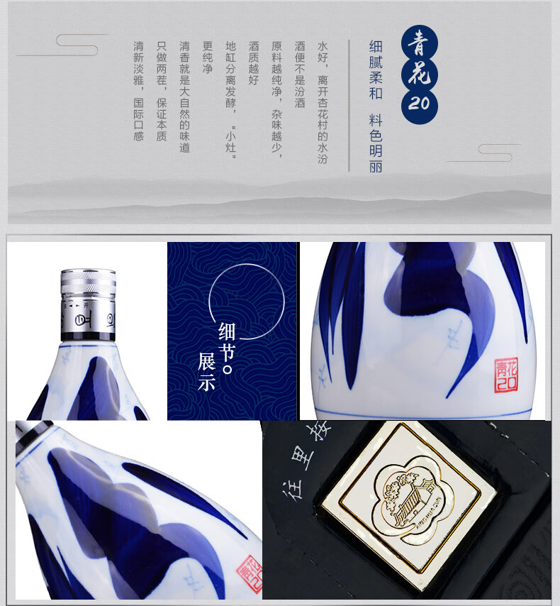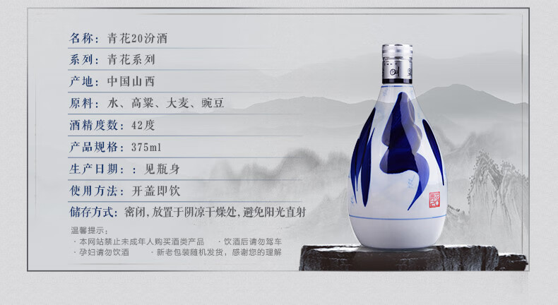 包装:整箱装;容量:376-499mL;香型:清香型;产地:山西;度数:40-49度;酒精度:42%vol;容量:372;产品重量:6900g;包装清单:汾酒 青花20 42度 375ml*6瓶 整箱装;