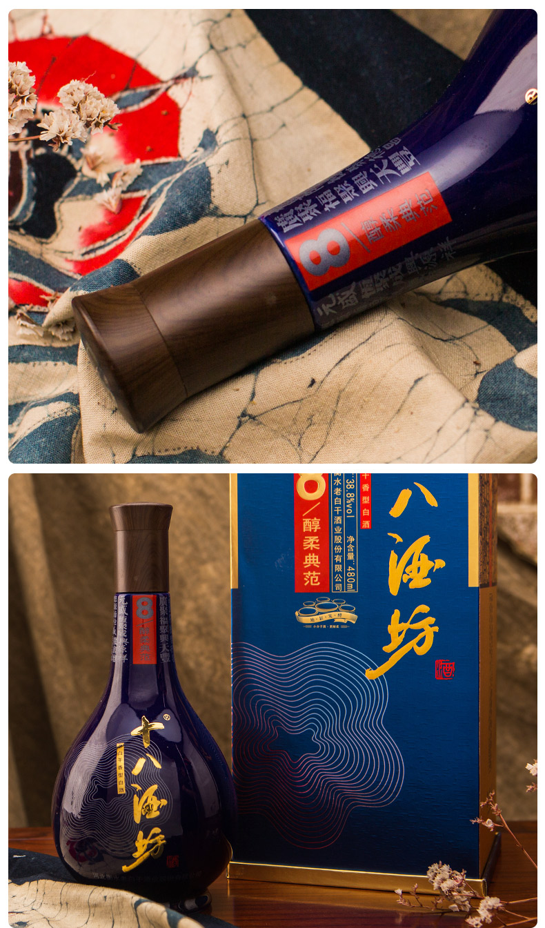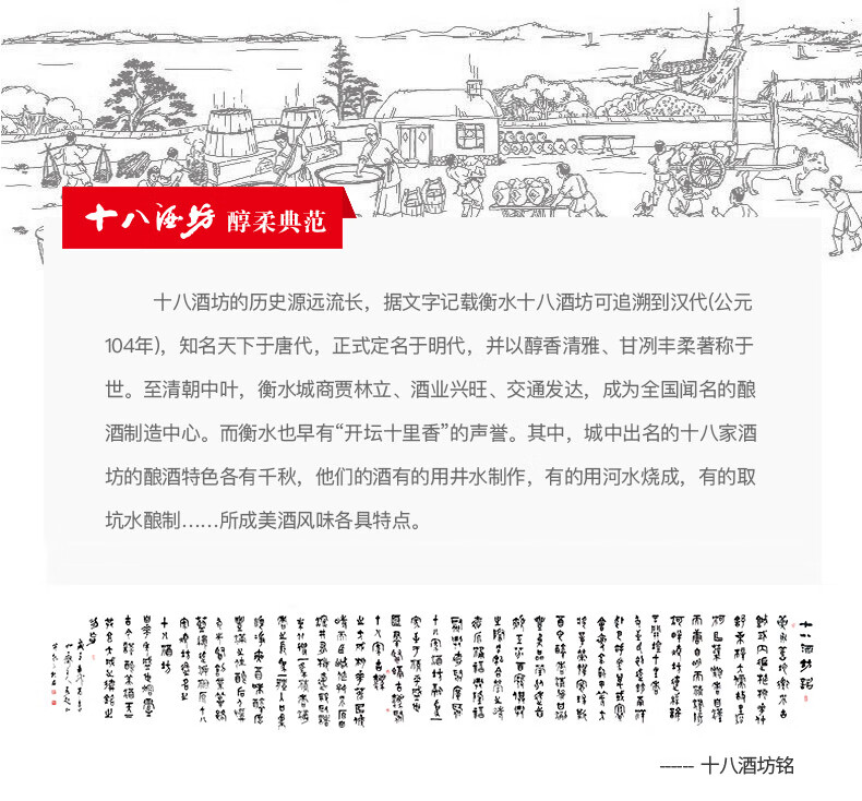 包装:整箱装;容量:376-499mL;香型:老白干香型;度数:35-39度;香型:老白干香型;产地:河北;酒精度:38.8%vol;包装:整箱装;容量:480ml*4;产品重量:6300g;包装清单:十八酒坊38.8度醇柔8 480ml*4瓶;