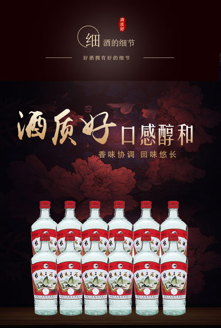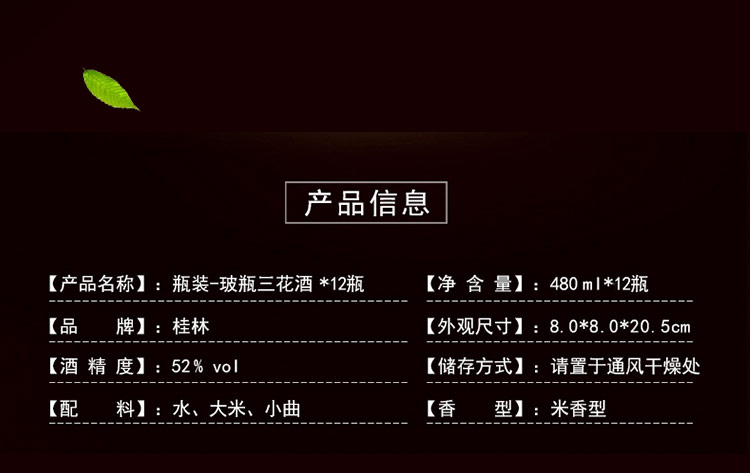 包装:整箱装;容量:376-499mL;香型:其它;产地:广西;度数:50度及以上;酒精度:52%vol;容量:480ml;产品重量:10130g;包装清单:桂林三花酒 高度白酒 米香型 玻瓶 52度 480ml*12瓶 整箱装;