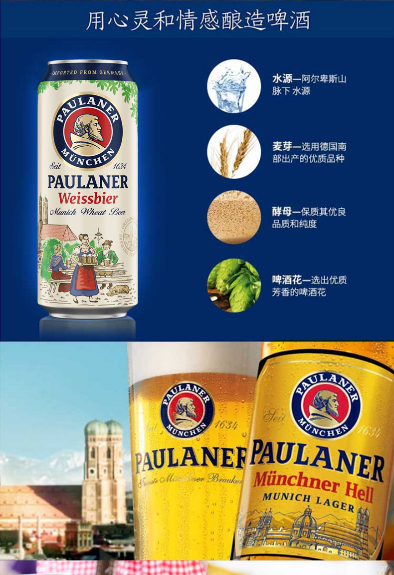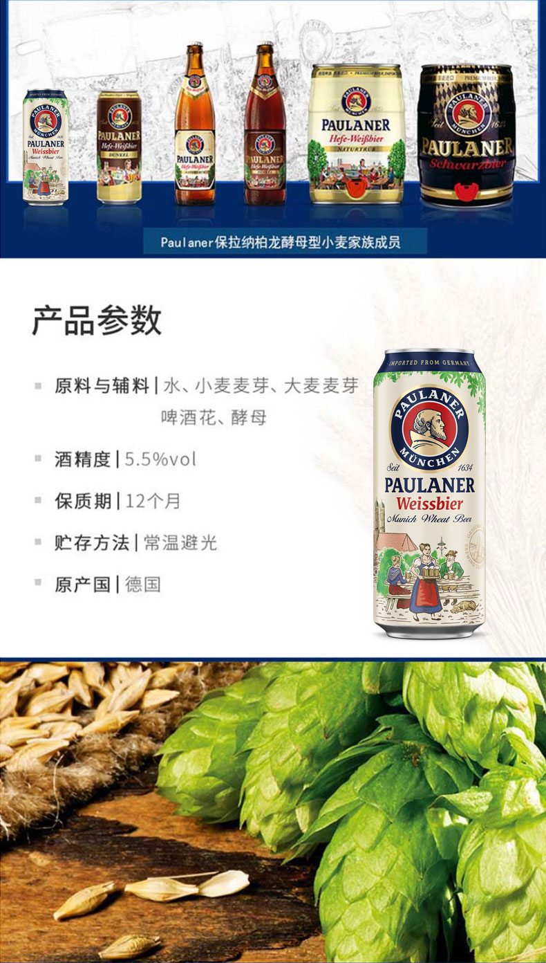 国产/进口:进口;产地:德国;适用场景:礼节拜访,家庭聚会,自斟自饮,情侣约会,烧烤撸串,派对必备,酒吧夜店;包装:听装;容量:500mL;类别:黄啤酒;原料:水、麦芽、啤酒花;系列:酵母型小麦;保质期:365天;酒精度:5.5%vol;原产地:德国;原麦汁浓度:12.5°P;存储方法:常温避光保存;产品重量:12.62kg;容量:500ml;包装清单:保拉纳/柏龙(PAULANER)小麦啤酒 500ml*24听整箱装 德国进口*1;