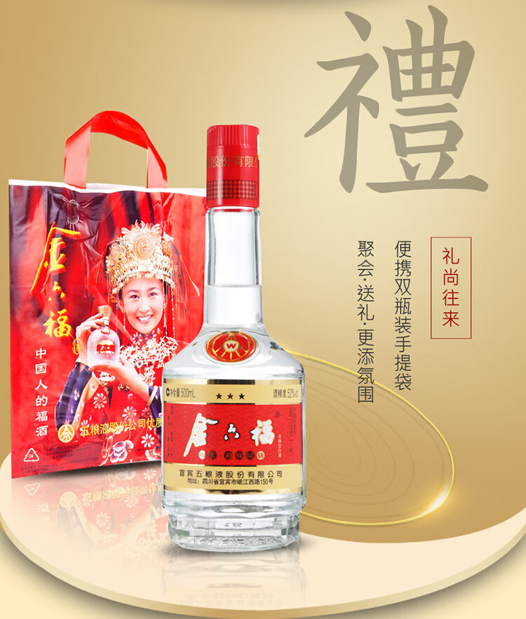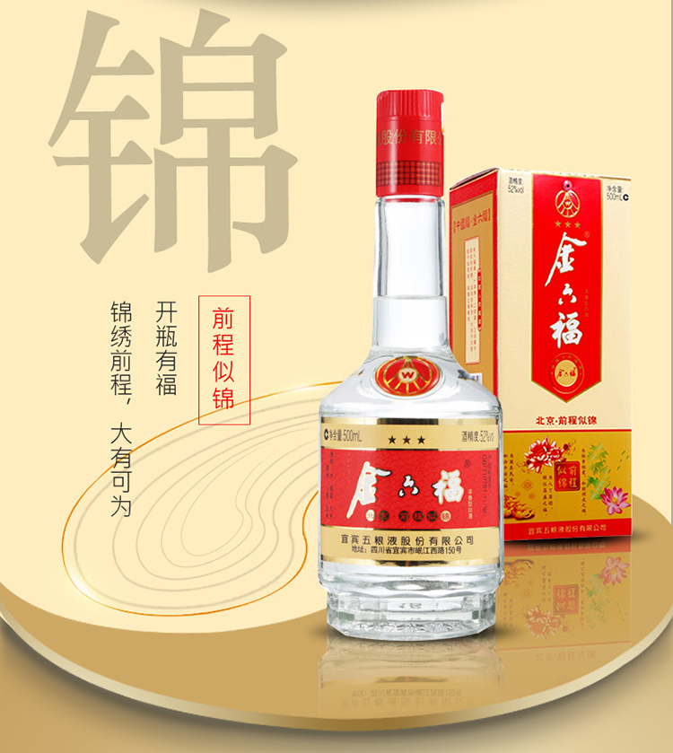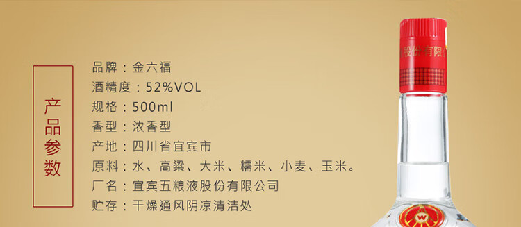 包装:整箱装;容量:500-749mL;香型:浓香型;产地:四川;度数:50度及以上;酒精度:52%vol;容量:500;产品重量:500g;包装清单:高度白酒 金六福 前程似锦三星52度整箱装(内含3支手提袋)500ml*6瓶*1;