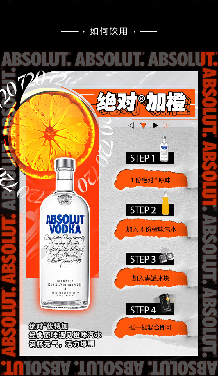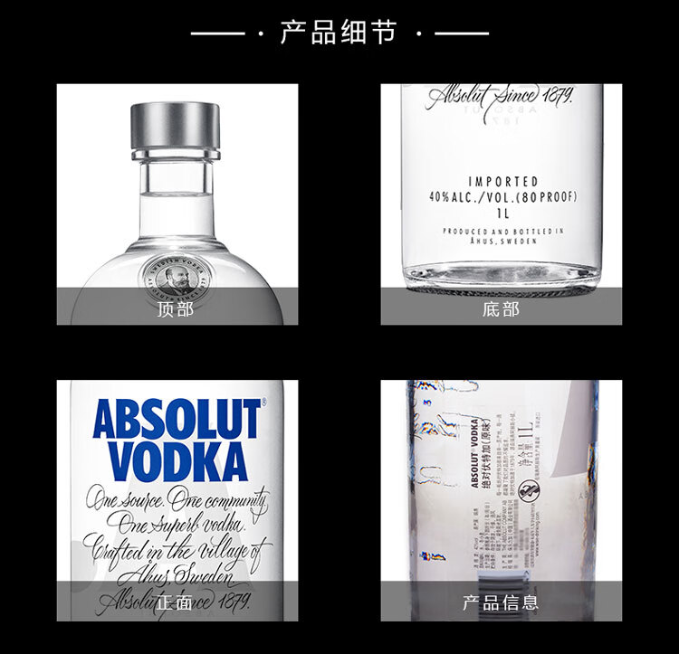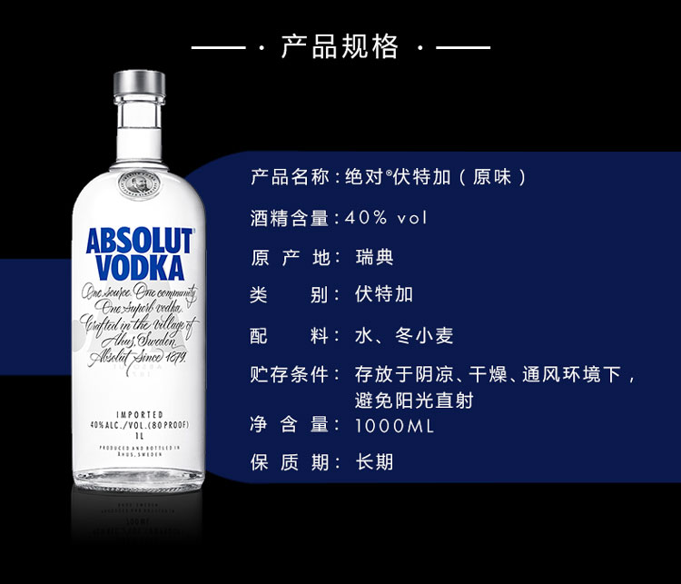 适用场景:家庭聚会,商务宴请,自斟自饮;包装:瓶装;容量:1L及以上;国产/进口:进口;产地:瑞典;原料:优质冬小麦、纯净深泉水;保质期:长期;酒精度:40%vol;存储方法:通风、干燥、阴凉处;容量:1000mL;产品重量:1.6kg;包装清单:绝对伏特加(Absolut Vodka)洋酒 伏特加 1000ml(1L)*1;