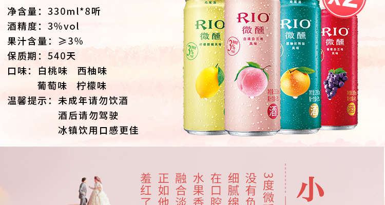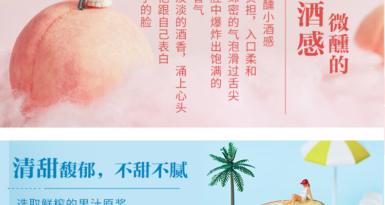 国产/进口:国产;产地:中国大陆;适用场景:家庭聚会,商务宴请,情侣约会,亲友馈赠,闺蜜私语;包装:其它;容量:200-374mL;原料:水、白砂糖、果葡糖浆、食品添加剂、食用香精等;保质期:540天;酒精度:3%vol;存储方法:请置于阴凉干燥处,避免高温和阳光直晒,禁止加热或0℃以下冷冻,切勿撞击。;容量:330mL;产品重量:2.84kg;包装清单:微醺3度白桃*2+微醺3度柠檬*2+微醺3度葡萄*2+微醺3度西柚*2;