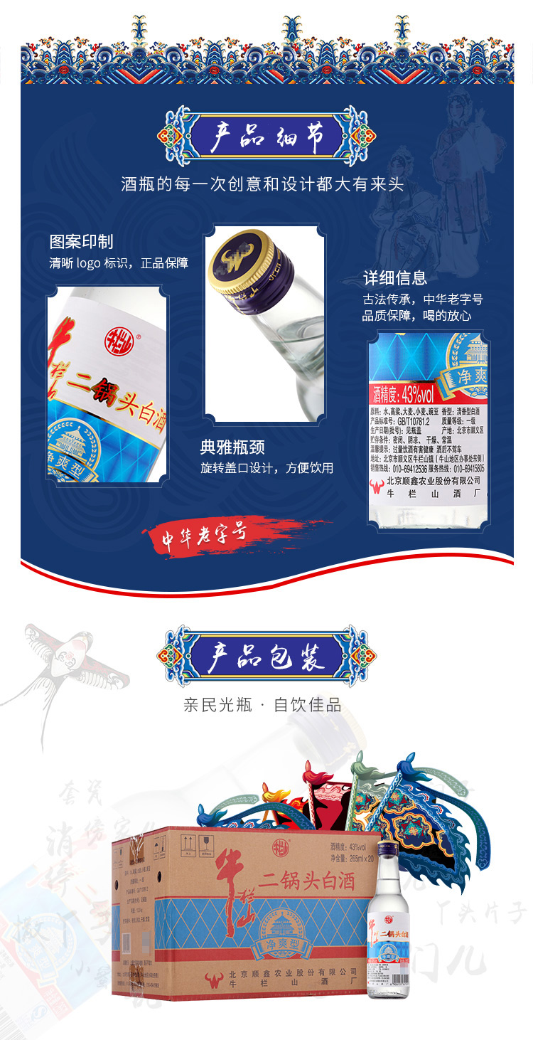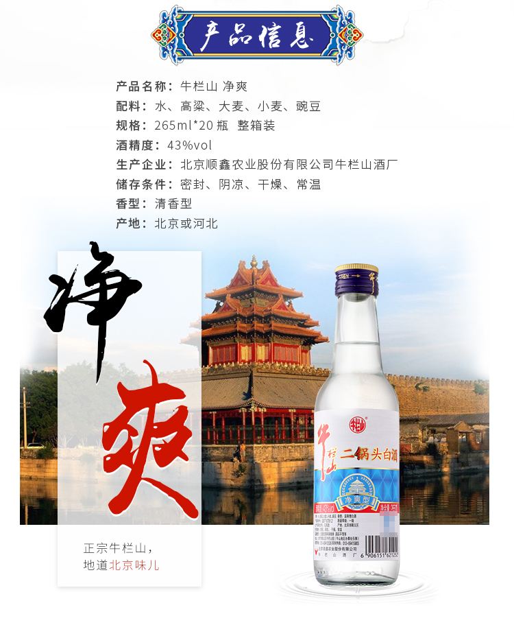 包装:整箱装;容量:375mL及以下;香型:清香型;产地:北京;度数:40-49度;酒精度:43%vol;容量:265ml;产品重量:100500g;包装清单:牛栏山 净爽 二锅头 43度 265ml*20瓶 整箱装 清香型白酒*1;