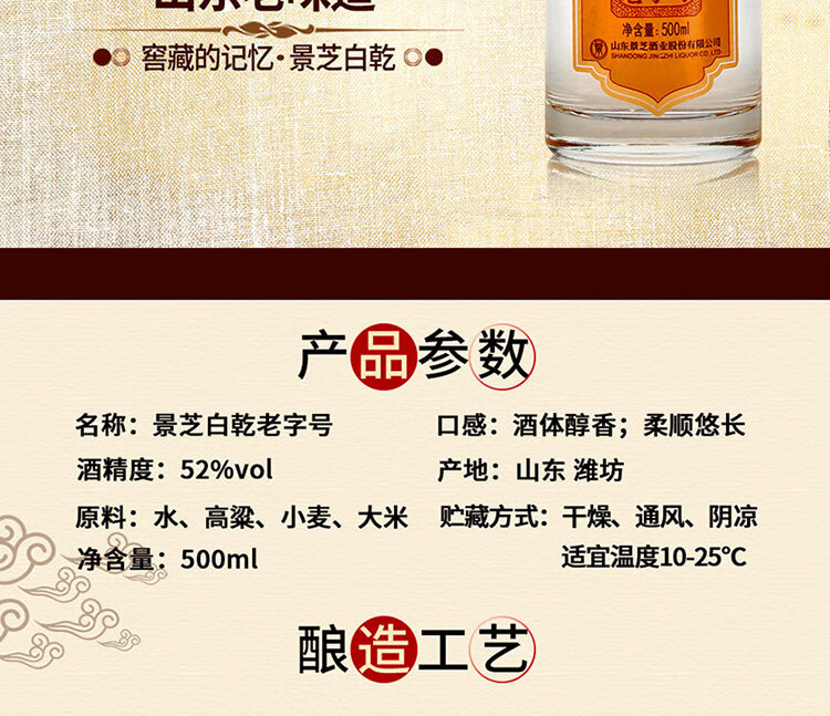 包装:整箱装;容量:500-749mL;香型:其它;产地:山东;度数:50度及以上;酒精度:52%vol;容量:500ml;产品重量:6000g;包装清单:景芝 白乾 52度 500ml*6瓶 整箱装 *1;