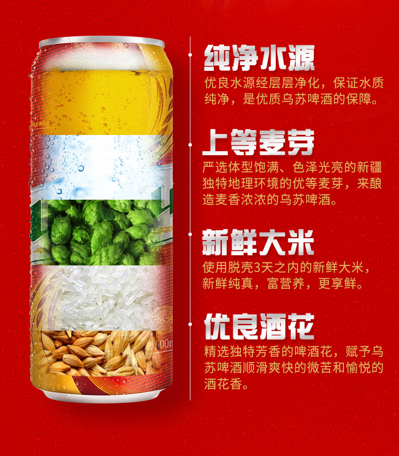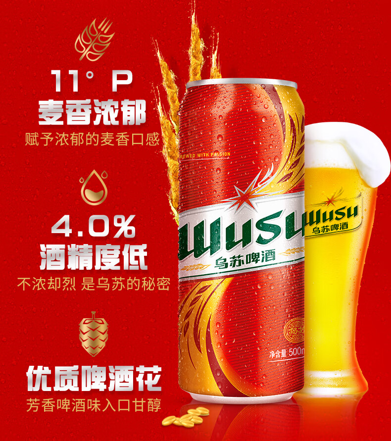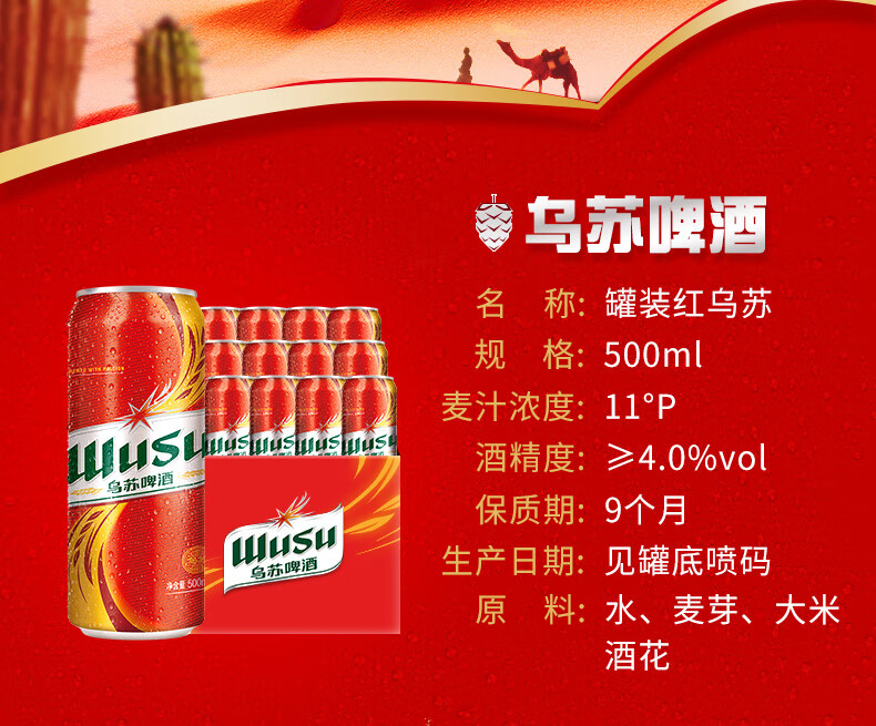国产/进口:国产;产地:中国大陆;适用场景:礼节拜访,家庭聚会,自斟自饮,情侣约会,烧烤撸串,派对必备,酒吧夜店;包装:听装;容量:500mL;类别:黄啤酒;原料:水,麦芽,大米,啤酒花;保质期:270天;酒精度:4%VOL;原产地:中国大陆;原麦汁浓度:11°P;存储方法:建议5-25℃干燥、通风、避光储存;产品重量:6.5kg;容量:500ml;包装清单:红罐乌苏500mL*12罐;