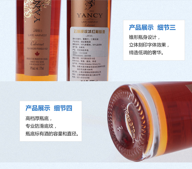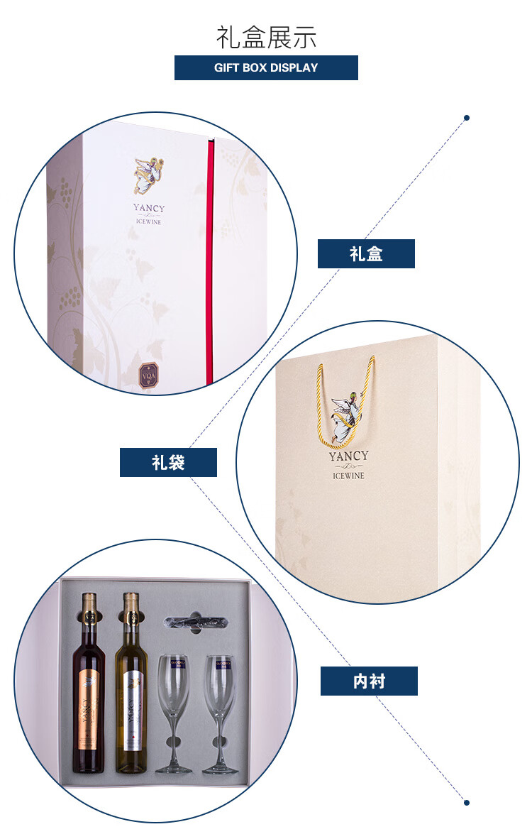颜色:柠檬黄;口感:清新;特性:其它;国产/进口:进口;适用场景:情侣约会,自斟自饮;包装:礼盒装;酸度:中酸;类别:冰酒/贵腐/甜酒;葡萄品种:赤霞珠(Cabernet Sauvignon);类型:静止酒;香型:果香;产地:加拿大;容量:375mL;甜度:甜型;保质期:3650天;酒精度:见实物背标;原产地:加拿大;存储方法:避光、卧放;容量:750ml;产品重量:2.5kg;包装清单:云惜甜白375ml*1瓶、云惜甜红375ml*1瓶、精美酒杯*2个、酒刀*1个、精美礼袋*1个、甜蜜时光双支精品盒*1个;