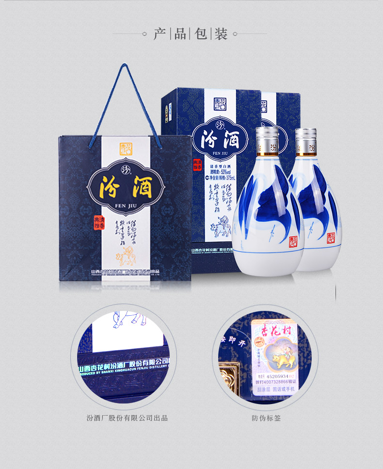 包装:整箱装;容量:376-499mL;香型:清香型;产地:山西;度数:50度及以上;酒精度:53%vol;容量:375;产品重量:6770g;包装清单:汾酒 青花20 53度 375ml*6瓶 整箱装;