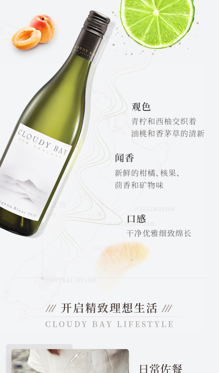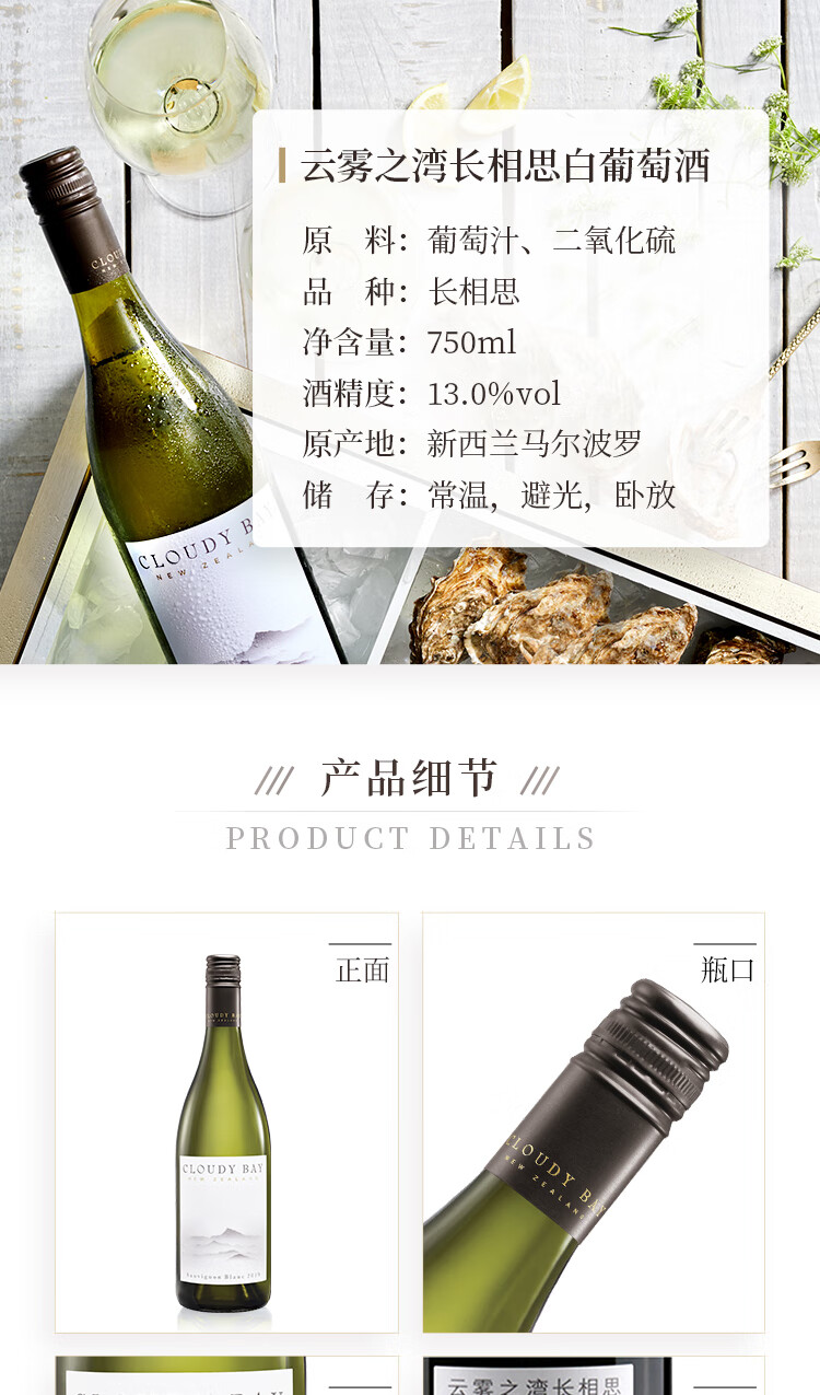 口感:清新;特性:其它;国产/进口:进口;适用场景:家庭聚会,礼节拜访,商务宴请,婚礼婚宴,情侣约会,自斟自饮,闺蜜私语,派对活动,收藏;包装:瓶装;类别:白葡萄酒;葡萄品种:长相思(Sauvignon Blanc);类型:其它;产地:新西兰;容量:750mL;甜度:干型;保质期:无;酒精度:13%vol;原产地:新西兰;存储方法:常温,避光,卧放;容量:750;产品重量:1.3kg;包装清单:云雾之湾 Cloudy Bay 长相思 干白葡萄酒 750ml 新西兰进口*1;
