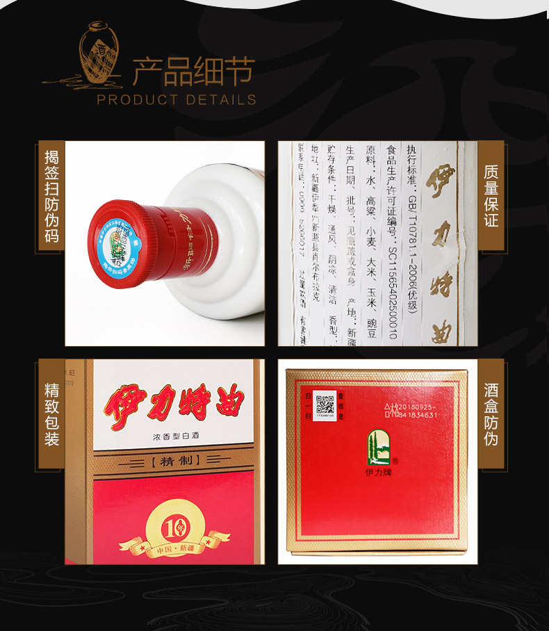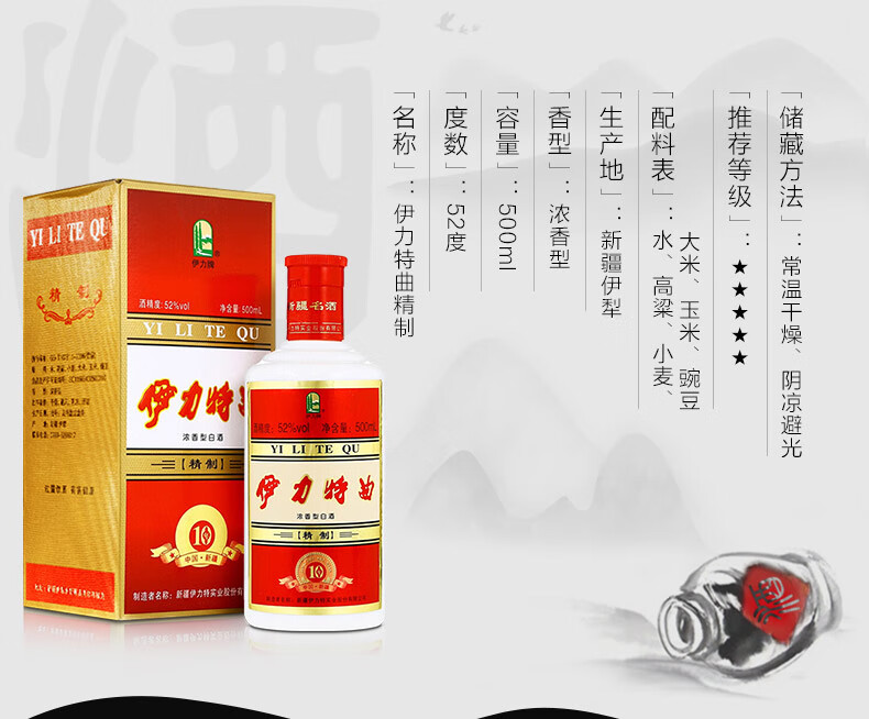 包装:整箱装;容量:500-749mL;香型:浓香型;产地:新疆;度数:50度及以上;酒精度:52%vol;容量:500ml*6瓶;产品重量:7000g;包装清单:52%伊力特曲500ml*6;