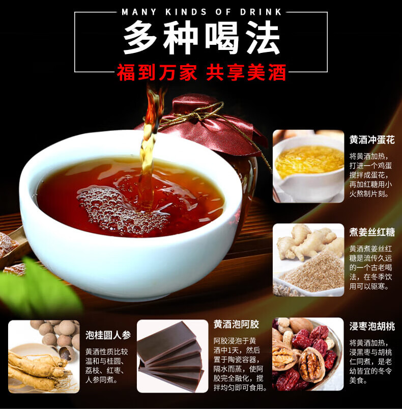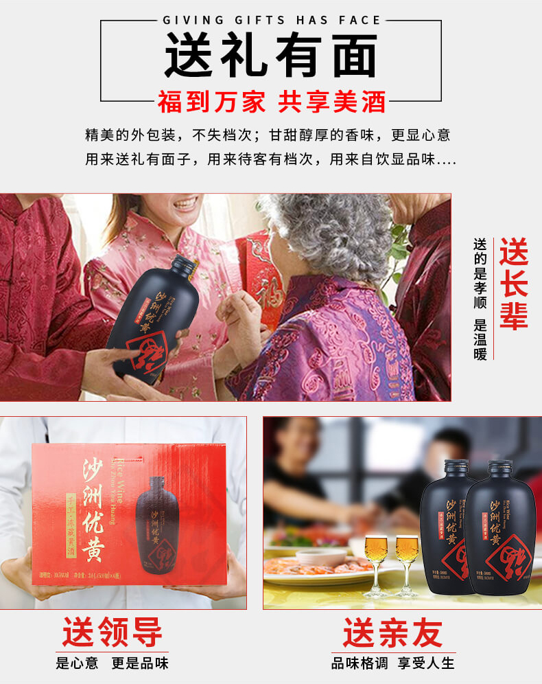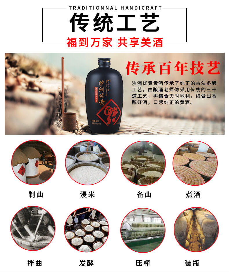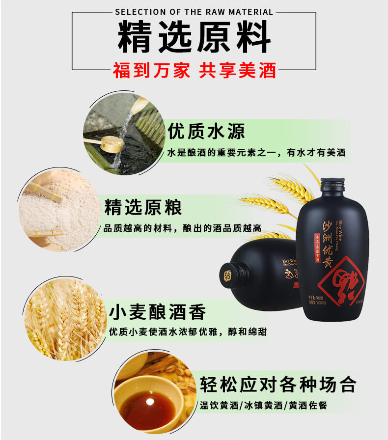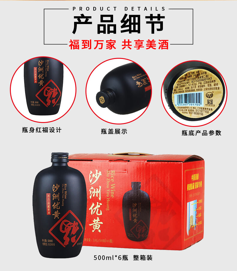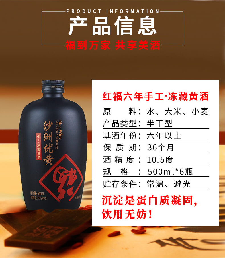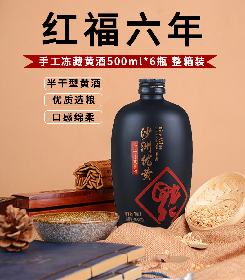 口味:半干型黄酒(总糖:15.0-40.0g/L);度数:10-19度;产地:江苏;适用场景:家庭聚会,礼节拜访,商务宴请,自斟自饮,朋友小聚;包装:整箱装;容量:1-5L;容量:3L;产品重量(kg):5.5;包装:整箱;存储方法:常温 避光;口味:半干型黄酒(总糖:15.0-40.0g/L);酒精度:10.5%;保质期:36个月;原产地:江苏;包装清单:沙洲优黄红福六年黄酒500ml*6瓶;