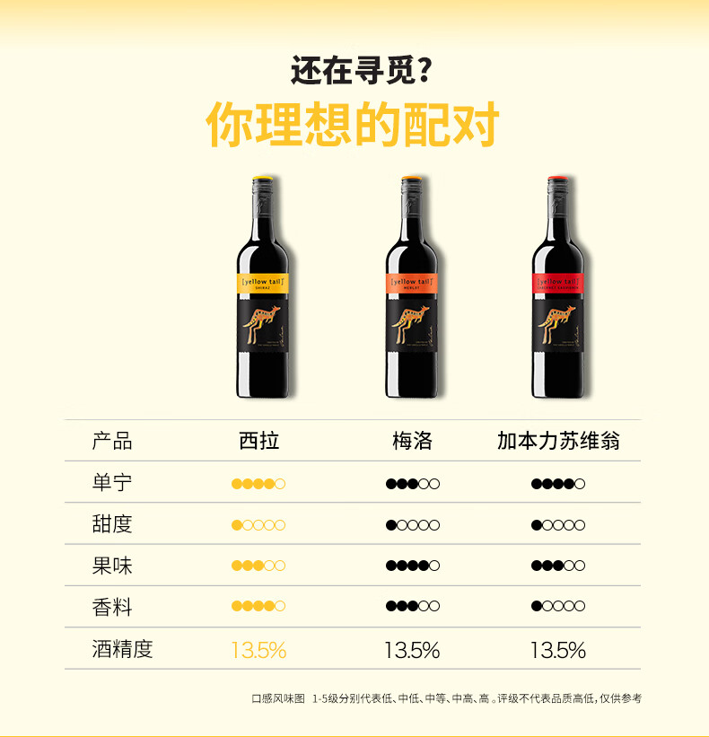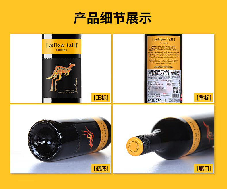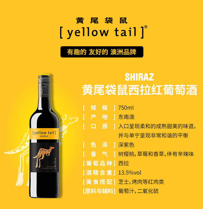 颜色:砖红色;口感:柔和;特性:普通餐酒;国产/进口:进口;适用场景:家庭聚会,自斟自饮,派对活动;包装:整箱装;酸度:低酸;类别:红葡萄酒;葡萄品种:西拉/设拉子(Syrah/Shiraz);类型:静止酒;香型:花香,果香;产地:澳大利亚;容量:750mL;甜度:半干型;系列:普通系列;保质期:详见实物酒标;酒精度:13.5%vol;原产地:澳大利亚;存储方法:避光、卧放或倒放、常温贮藏;容量:750ml;产品重量:7.28kg;包装清单:黄尾袋鼠西拉红葡萄酒整箱 750ml*6瓶;