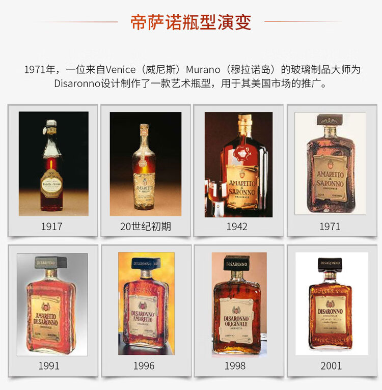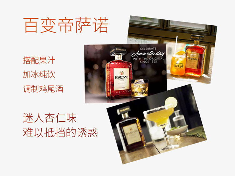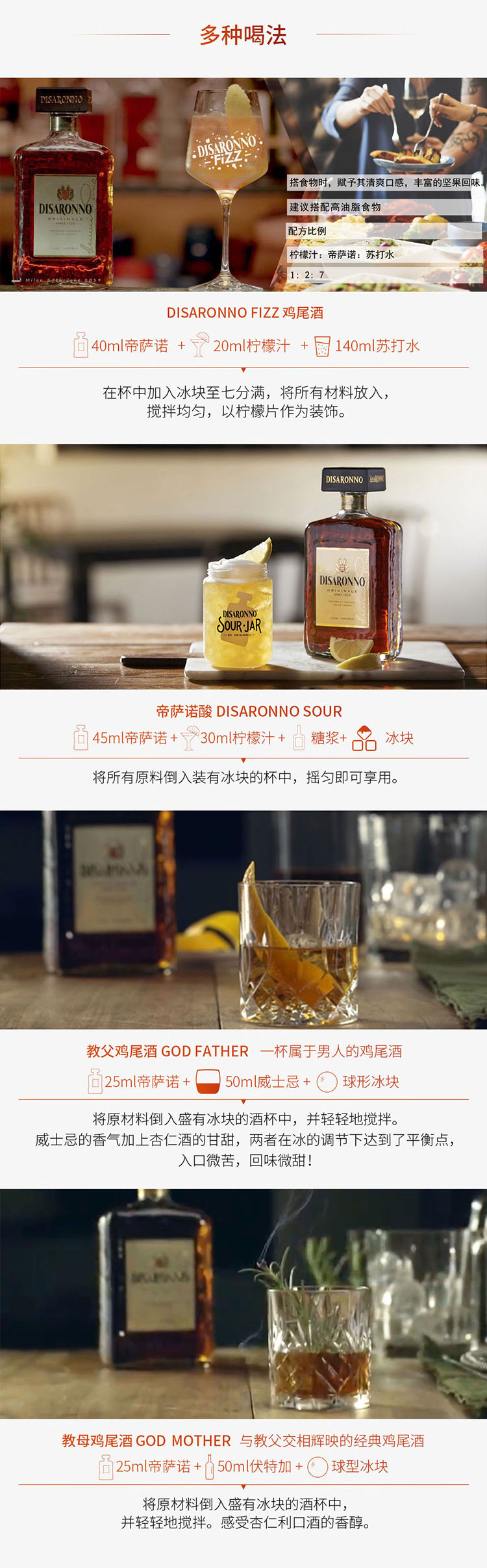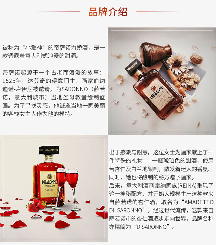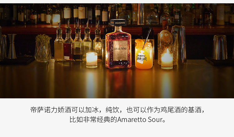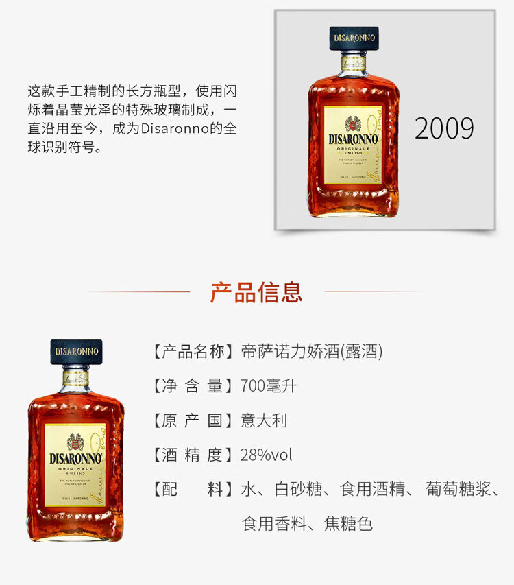 适用场景:自斟自饮,家庭聚会;包装:瓶装;容量:700-999mL;国产/进口:进口;产地:意大利;原料:水、白砂糖、食用酒精、葡萄糖浆、食用香料、焦糖色;保质期:无;酒精度:28%vol;存储方法:常温避光保存;容量:700mL;产品重量:1.5kg;包装清单:帝萨诺 Disaronno 力娇酒700ml*1;