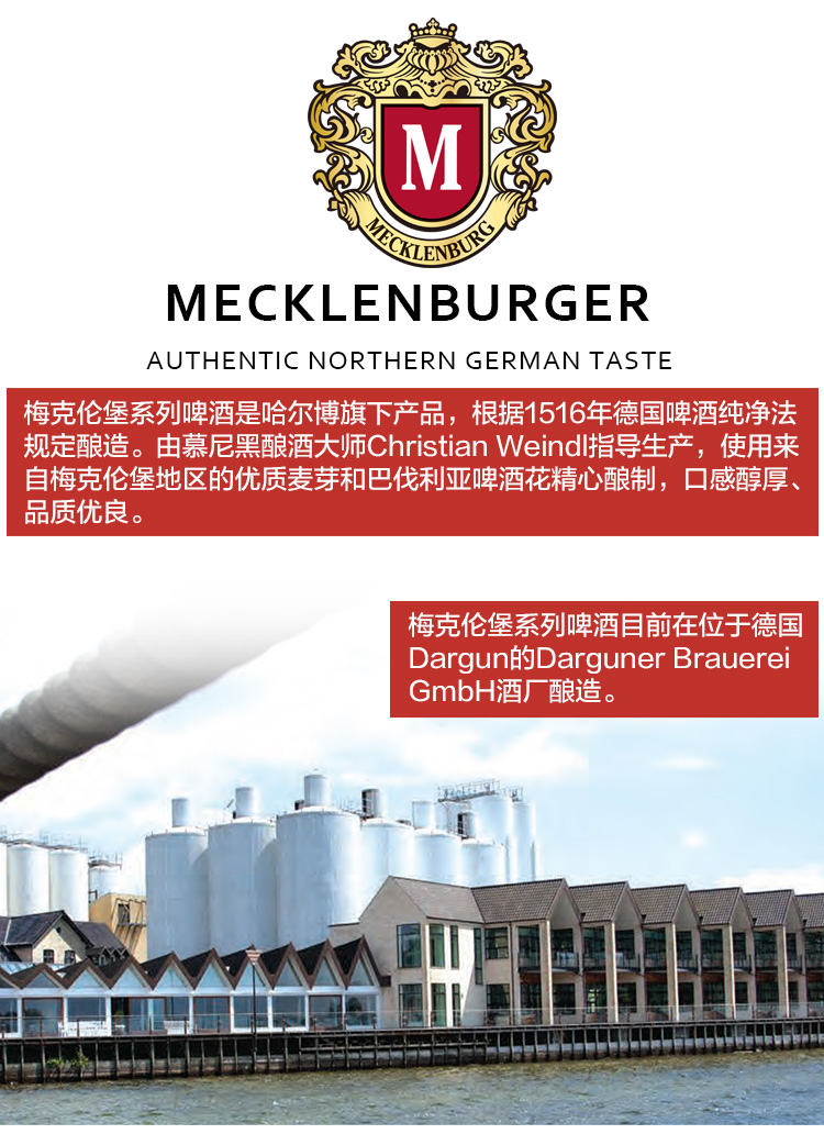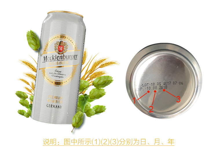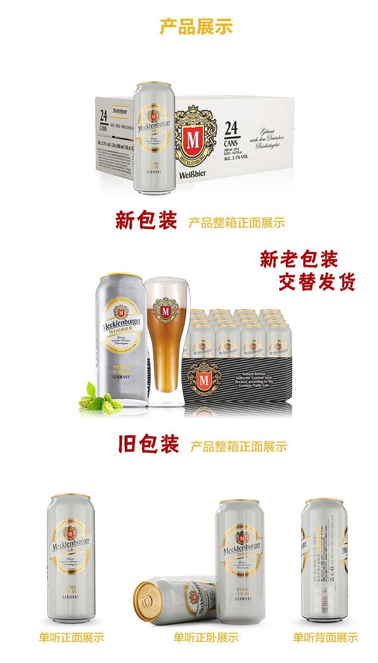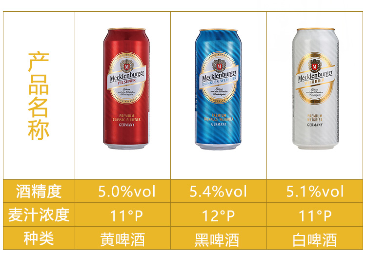 国产/进口:进口;产地:德国;适用场景:野餐出游,礼节拜访,家庭聚会,自斟自饮,情侣约会,烧烤撸串,派对必备,酒吧夜店;包装:听装;容量:500mL;类别:白啤酒;原料:水、小麦芽、大麦芽、啤酒花浸膏、啤酒花、酵母;保质期:15个月;酒精度:5.1;原产地:德国;原麦汁浓度:11°P;存储方法:常温避光;产品重量:12.75kg;容量:500ml;包装清单:德国进口梅克伦堡(Mecklenburger)小麦啤酒500ml*24听整箱装;