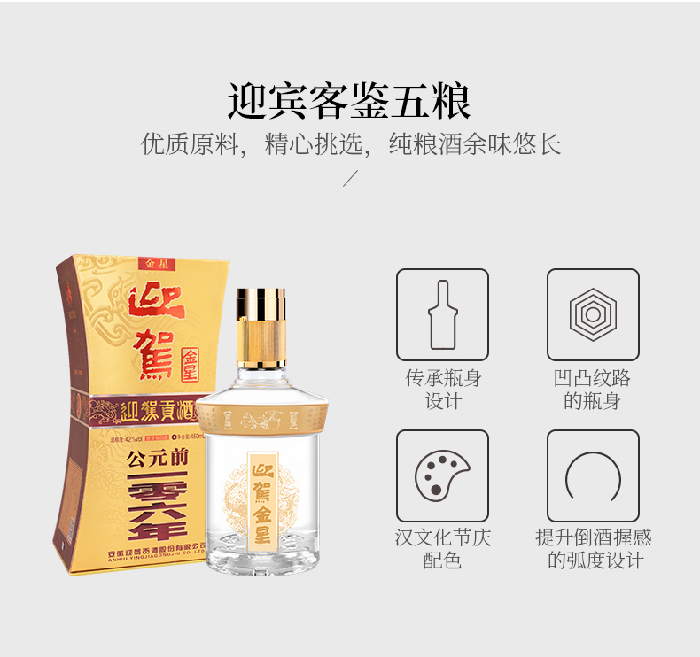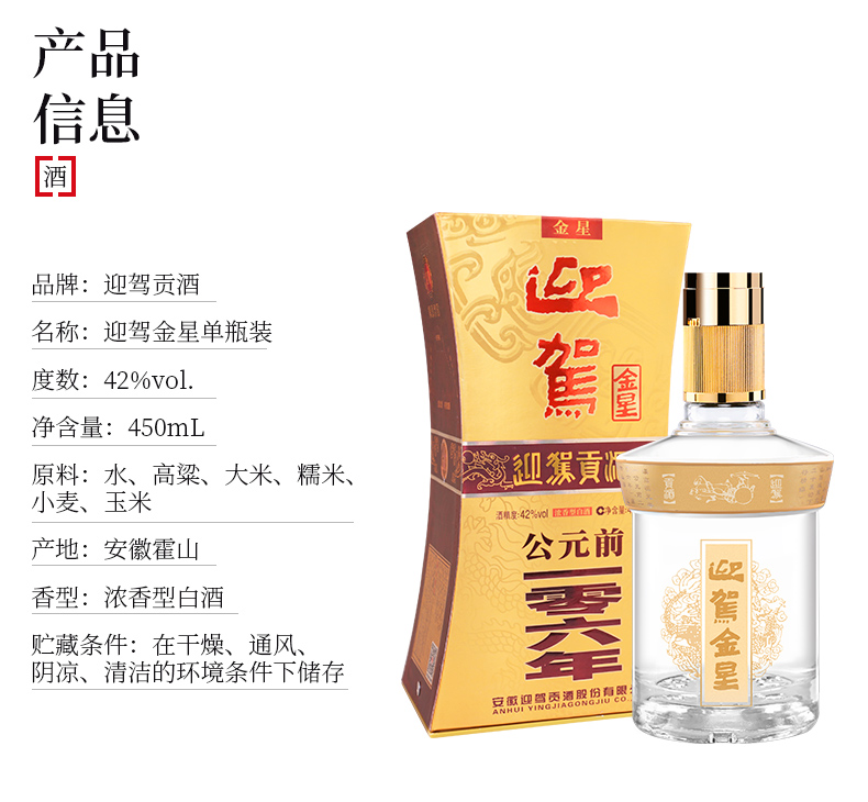 包装:瓶装;容量:376-499mL;香型:浓香型;产地:安徽;度数:40-49度;酒精度:42%vol;容量:450ml;产品重量:1380g;包装清单:迎驾贡酒 金星 42度 450ml*1;